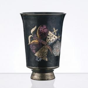 Vase à col ouvert à décor de papillons, céramique émaillée noir et or, monogrammé sous la base ABO, non signé, numéroté 3327, H 18,5 cm