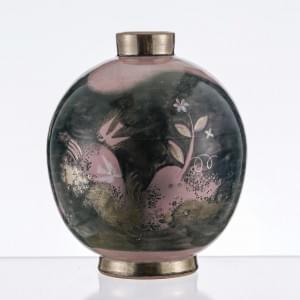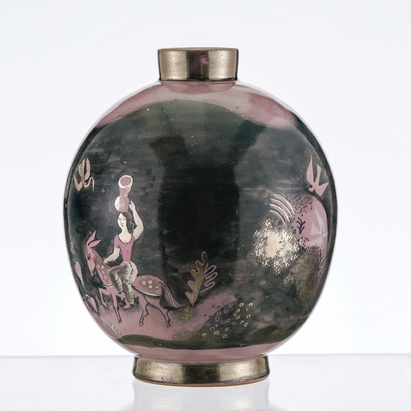 Grand vase boule à décor de porteuse d'eau sur un âne, céramique émaillée rose et noir, signé et numéroté 7679, percé, H 26 cm
