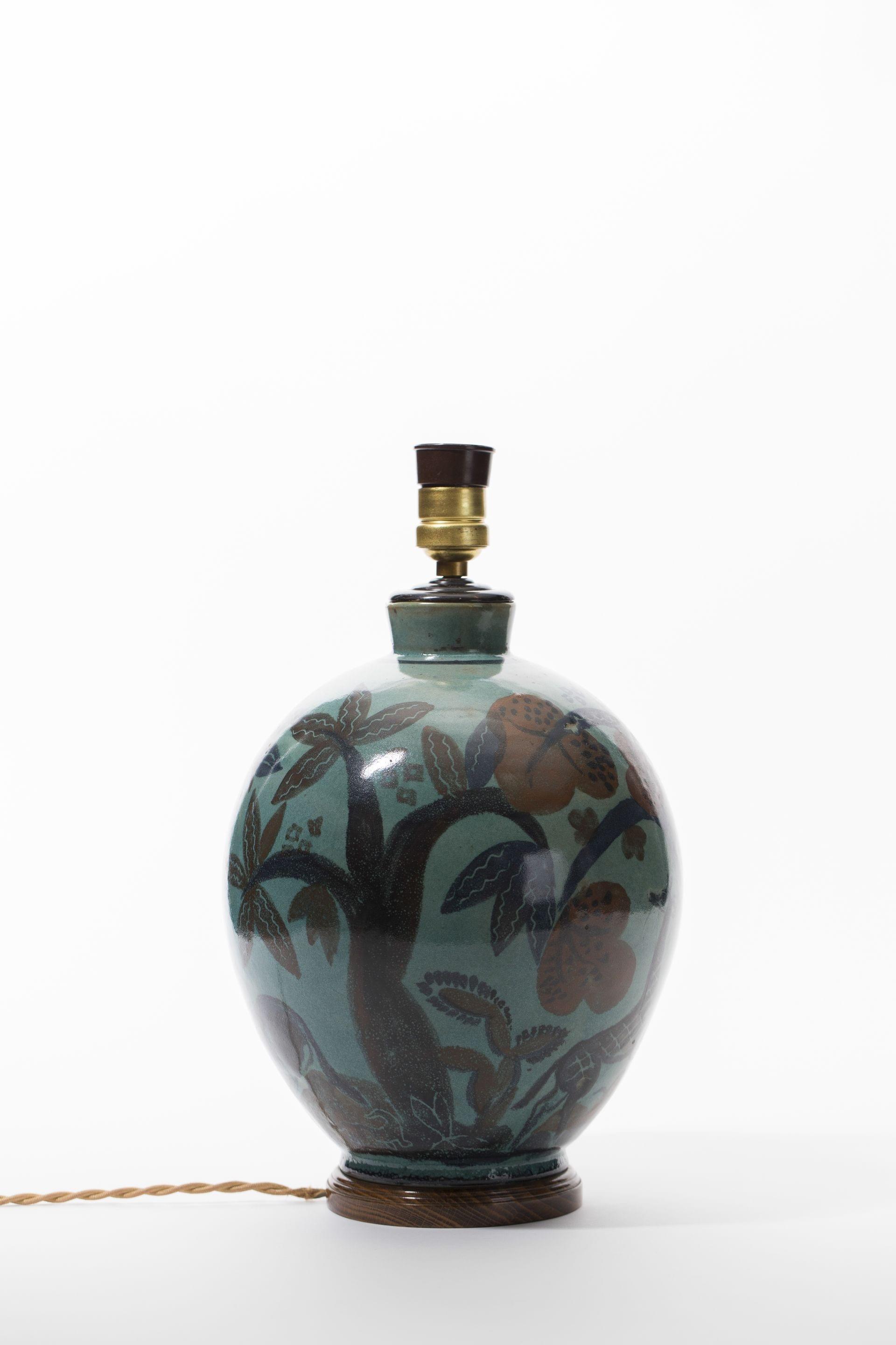 Pied de lampe, céramique émaillée turquoise, bleu et rouge à décor d'arbres et girafes, H 24 cm