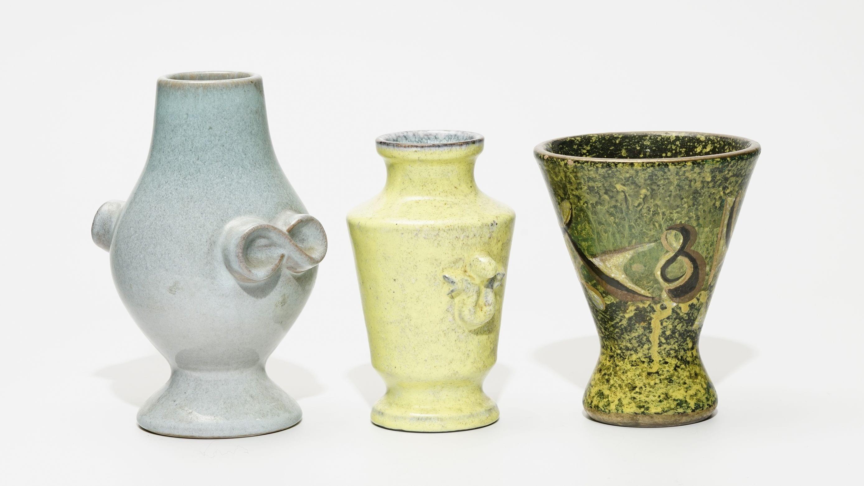Vase à anses à décor d'un bouquet, céramique émaillée violet, bl...