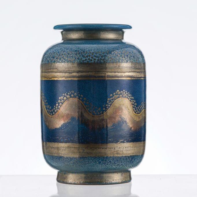 Vase à décor des lignes ondulantes, céramique émaillée bleu et argent, signé sous la base, numéroté 7113, H 23 cm. Exposé musée Ariana 2003