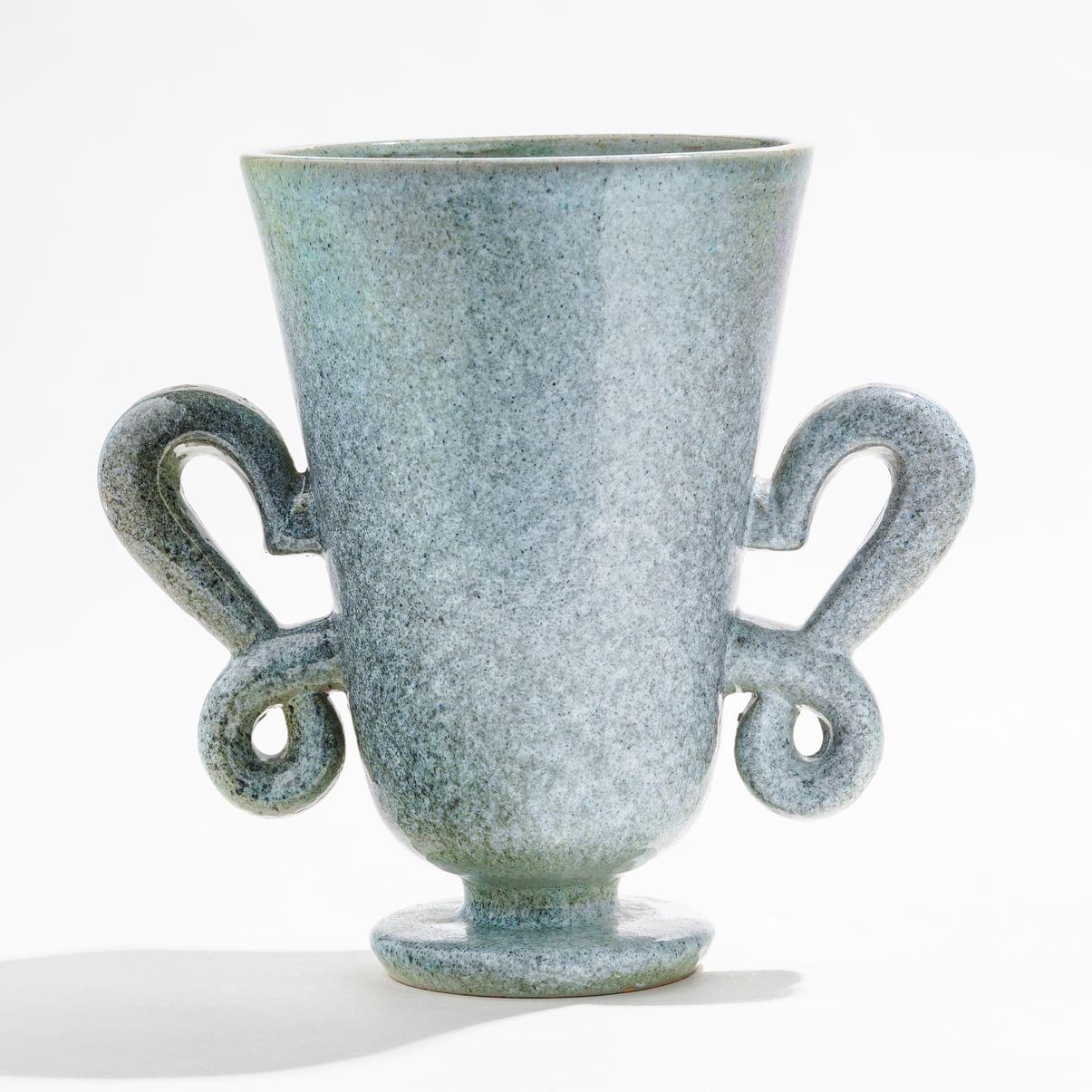 Vase balustre à anses serpentin, céramique émaillée à engobe vert-gris, signé sous la base, H 23 cm