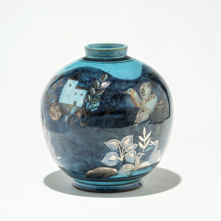 Vase boule, céramique émaillée à décor de canards sur fond bleu, signé, H 22 cm