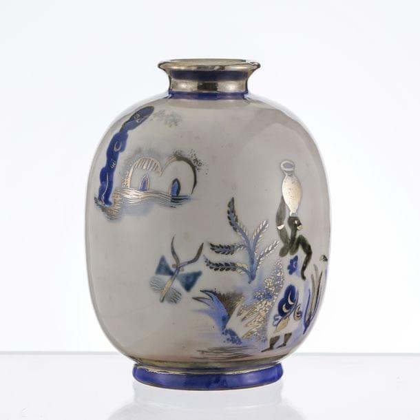 Vase ovoïde, céramique émaillée bleu blanc à décor d'une porteuse d'eau, signé sous la base, numéroté 4233, H 19 cm