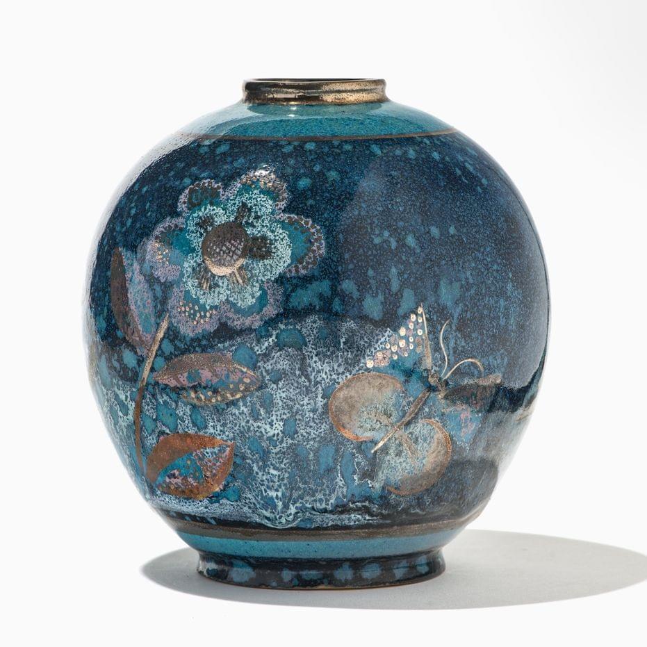 Vase boule papillon et fleurs, céramique émaillée en camaieu bleu, rose et or, H 18 cm