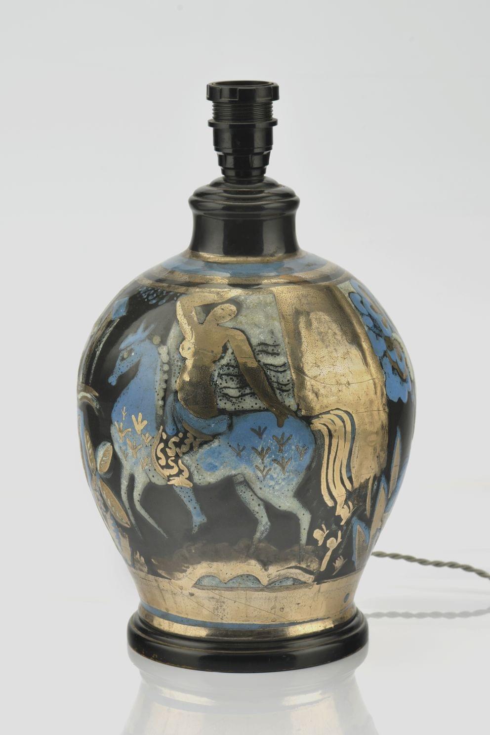Pied de lampe balustre, Ecuyère, vers 1930-1931, céramique émaillée en noir et bleu, H 29 cm
