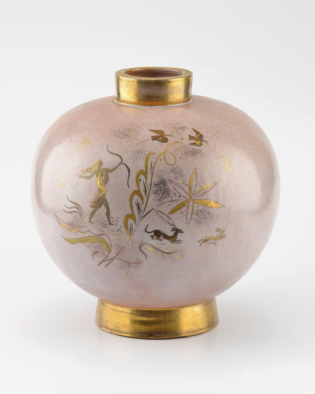 Vase boule, chasse à l'oiseau, céramique émaillée blanc et or, monogrammée MK, numérotée 16256, H 28 cm