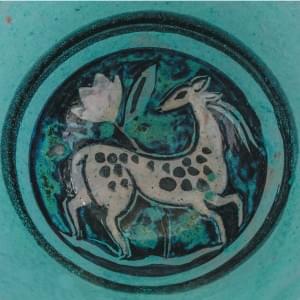 Coupe tronconique à décor de lion et d'antilopes, céramique émaillée turquoise, noir et rose, signée, D 23,5 cm