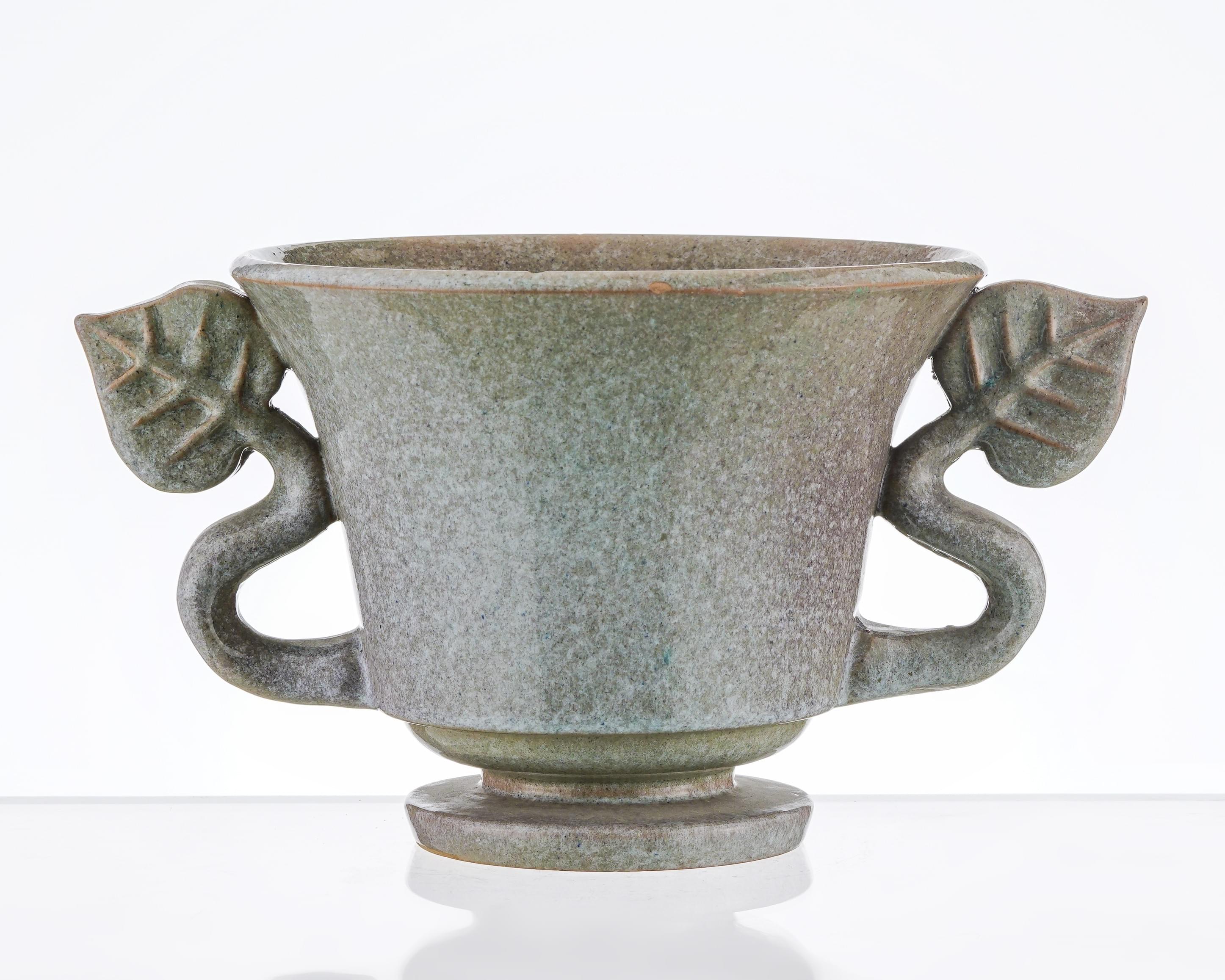 Vase à anses feuillagées, céramique émaillée gris moucheté, signé, H 16 cm