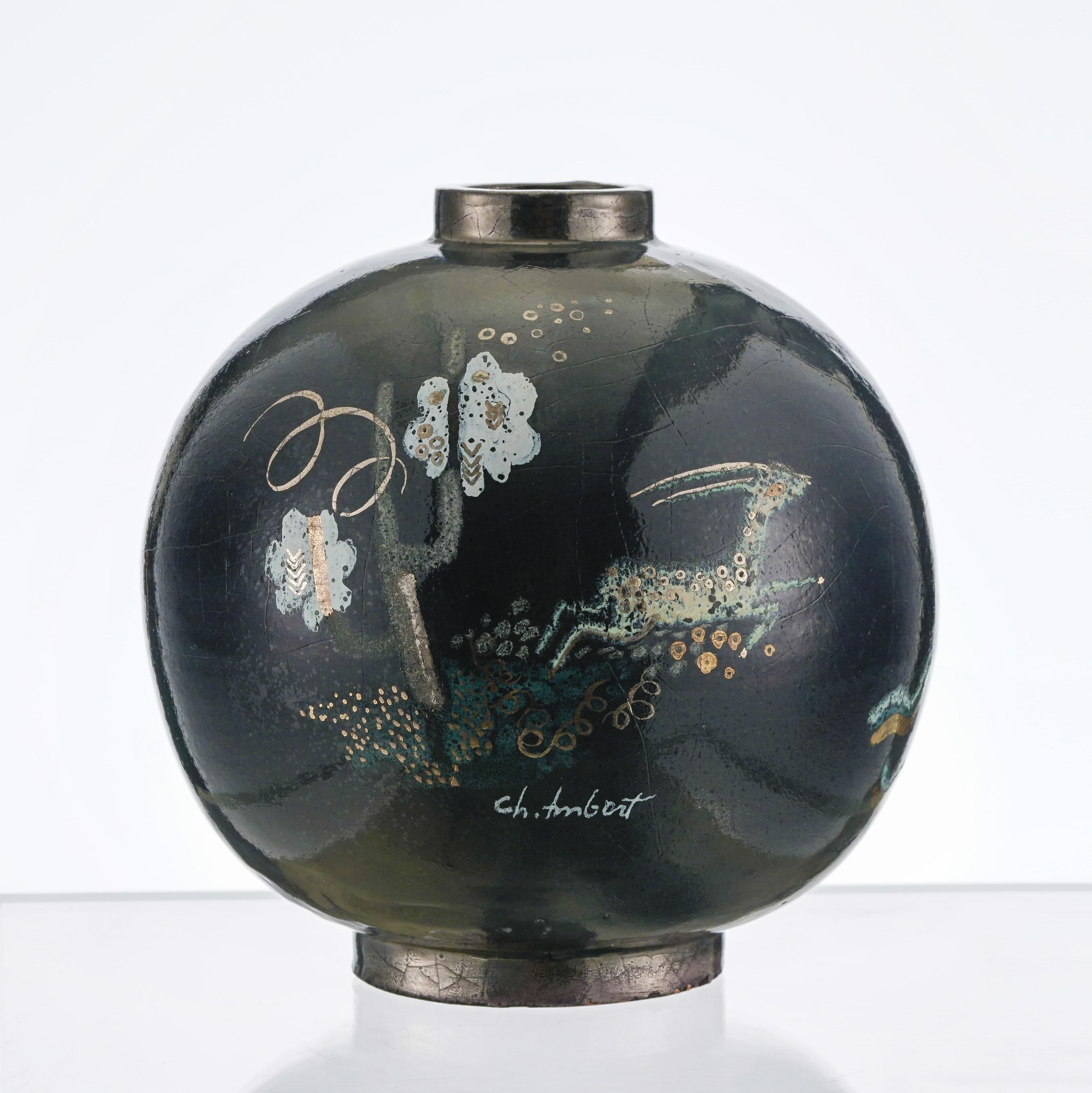 Vase boule à décor d'une antilope bondissante, céramique émaillée noir, blanc et argent, signé et numéroté 9099, H 19,5 cm