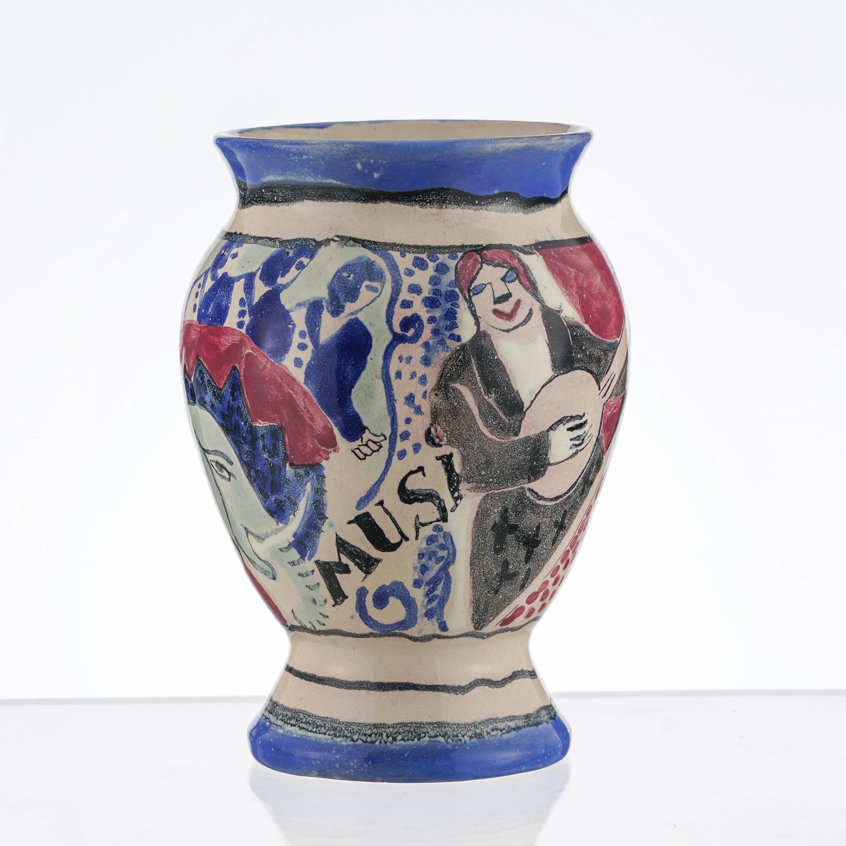 Vase balustre à décor d'un numéro de cirque, céramique émaillée bleu, blanc et rouge, signé et daté 1930, H 20,5 cm