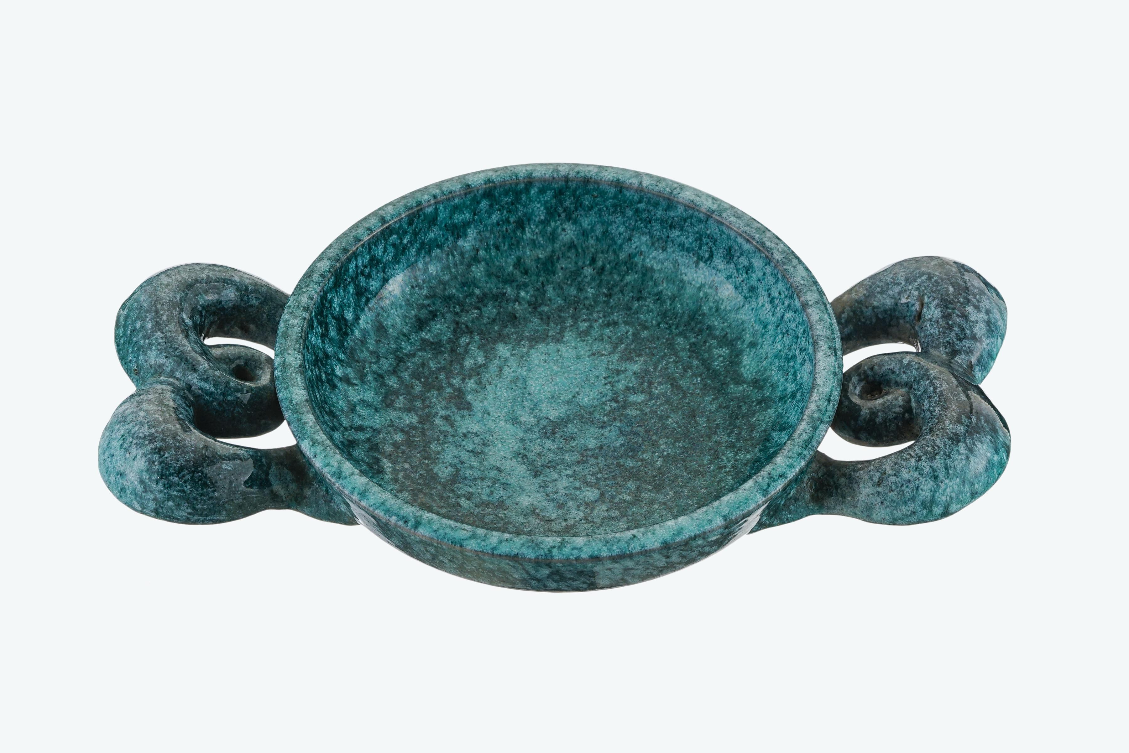 Coupelle circulaire à deux anses volutes, céramique émaillée bleu turquoise, signé, L 33 cm