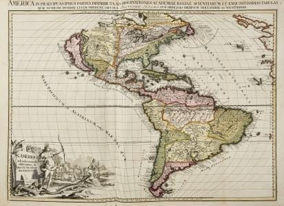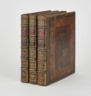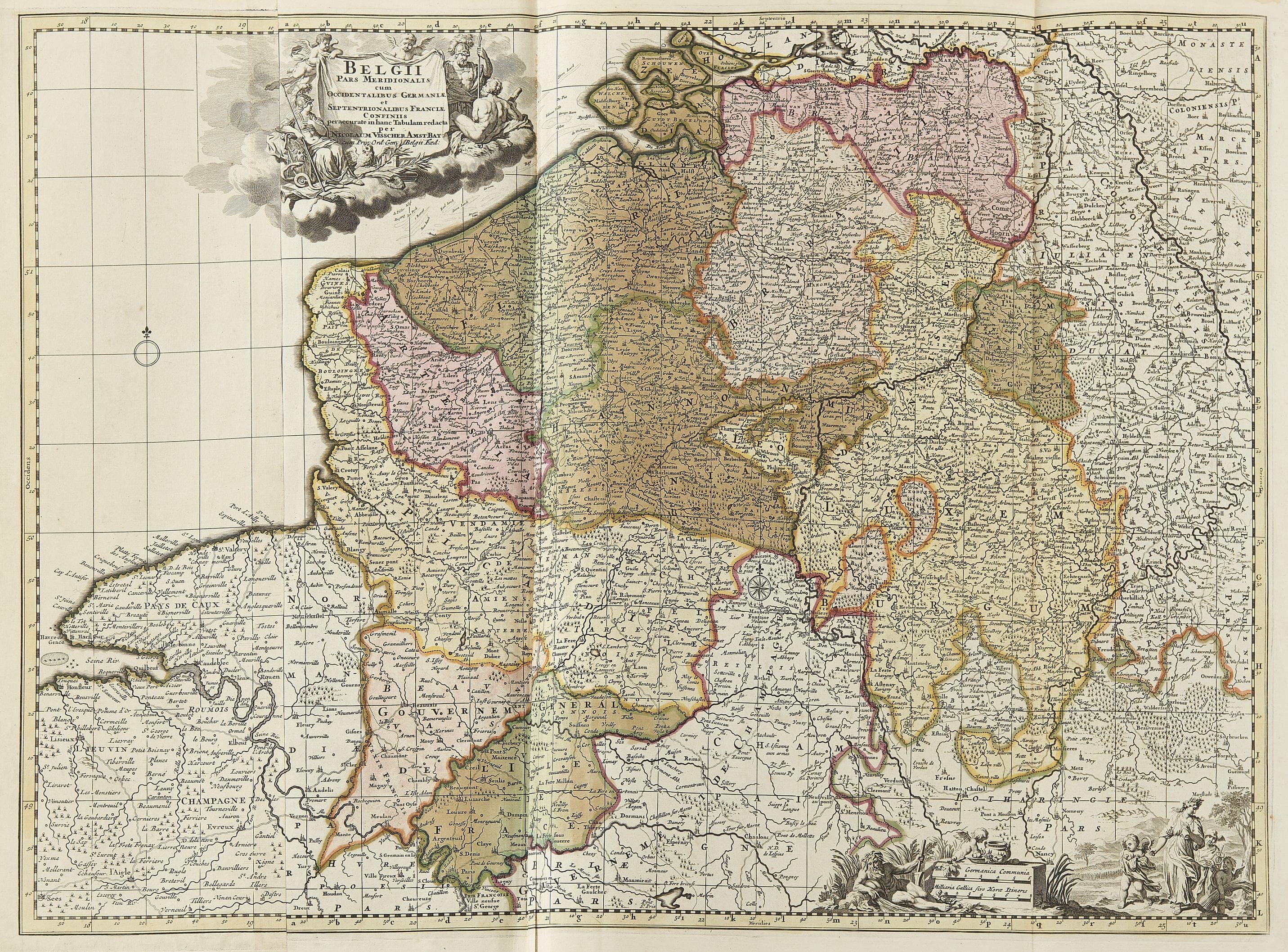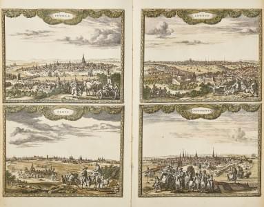 par les géographes tels que VISSCHER (pour la plupart), HOMANN, MORDEN, DELISLE, DE WITT… Les cartes ont été imprimées entre 1684 et la deuxième moitié du XVIIIème siècle. Chaque carte est gravée en noir puis rehaussée en couleurs au trait. L’ensemble est réuni en un volume grand in folio, vélin à décor estampé ancien (reliure très accidentée). On trouve les cartes suivantes : Europe représentée par la Géographie naturelle et historique et par le Blason (1, double page), Flandres, Belgique et Pays-Bas (49), Espagne et Portugal (10), France et Corse (22), Suisse, dont Neuchâtel (7), états d`Italie (11), Saint-Empire Romain Germanique, Autriche et Hongrie (46), Grande-Bretagne et Irlande (18), Scandinavie (6), Russie (3), Grèce (3), Malte (1), Asie, Chine, Ceylan, Inde (4), Afrique (4), Terre Sainte et Empire Ottoman (4), Perse (1), Amérique, Golfe du Mexique, Caraïbes, Jamaïque, Martinique et Brésil (10), vues des villes d’Europe (24). Quelques rousseurs, brunissures, rares petites déchirures sur certains feuillets.