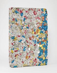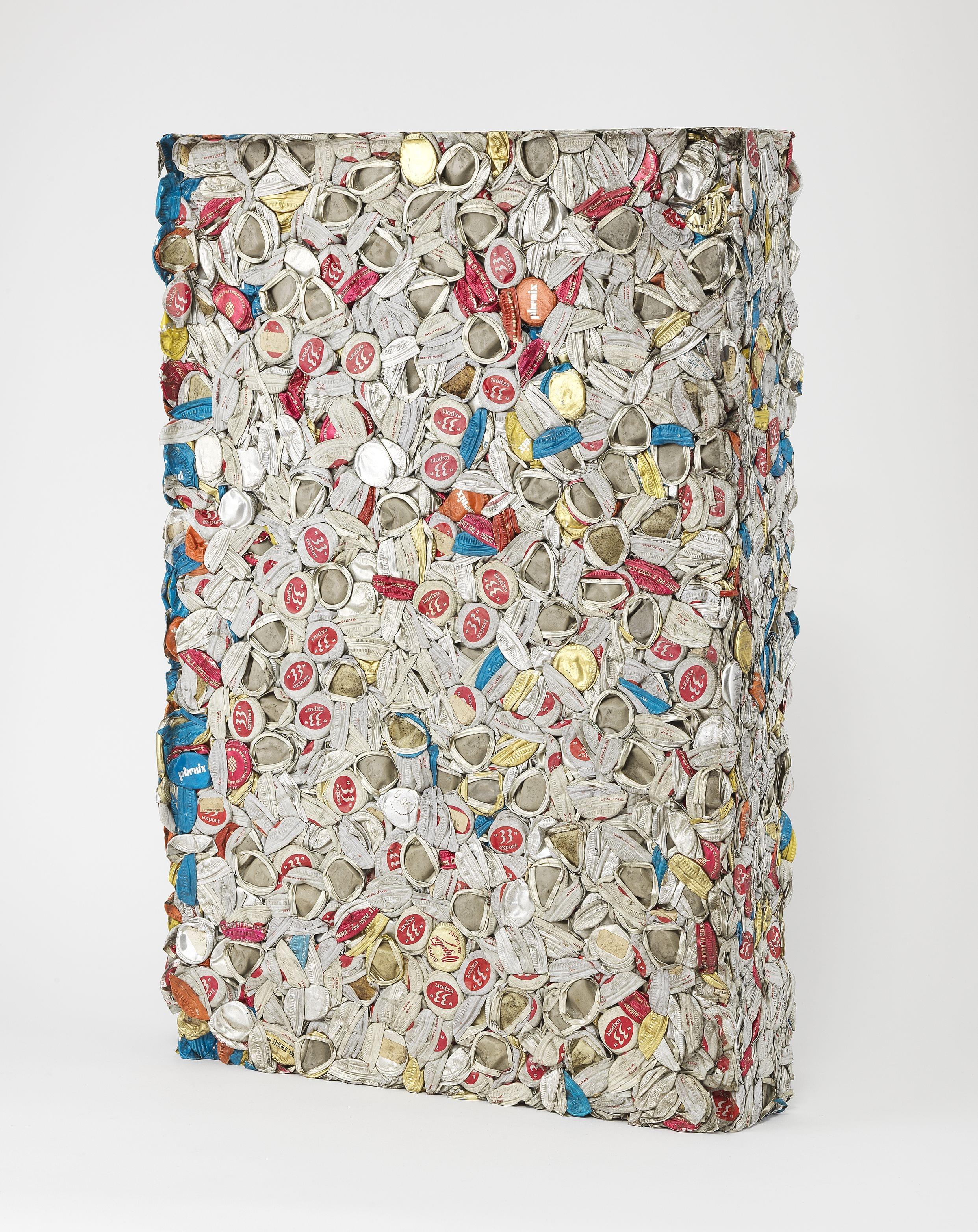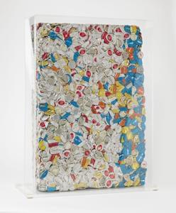 Compression de capsules de bière, non signée, 60x40x8 cm. Non répertoriée par les archives Denise Durand-Ruel. Provenance selon le vendeur: échange entre l'artiste et Gérald Minkoff.