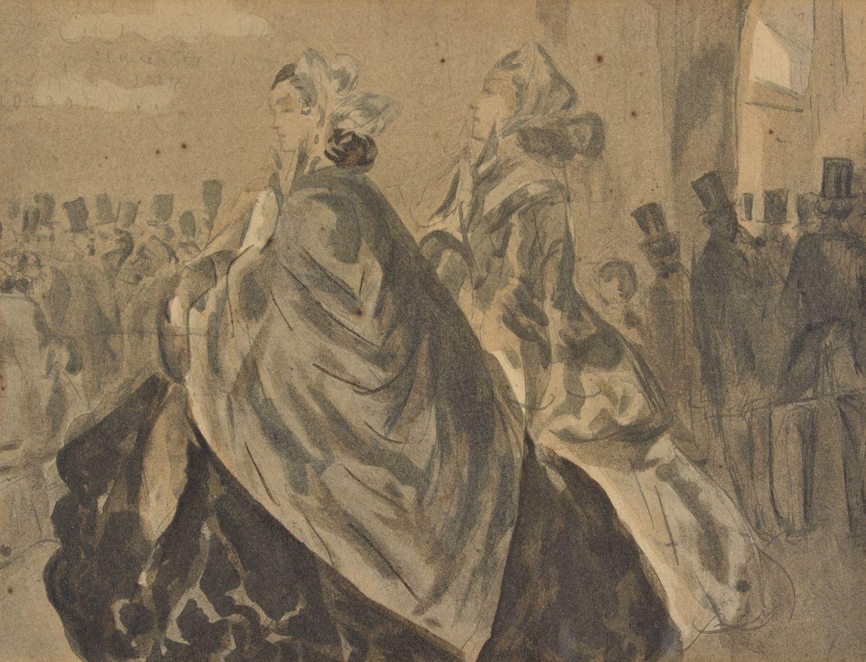 Rencontre à la promenade, crayon et lavis sur papier, non signé,...