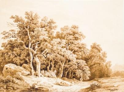 Chemin à l'orée du bois, aquarelle sépia sur papier, signée, 24x...