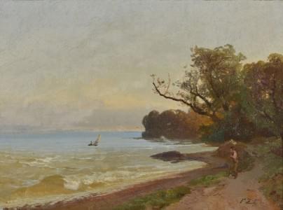 Vieil homme au bord du lac, huile sur panneau signée, 26 x 34 cm