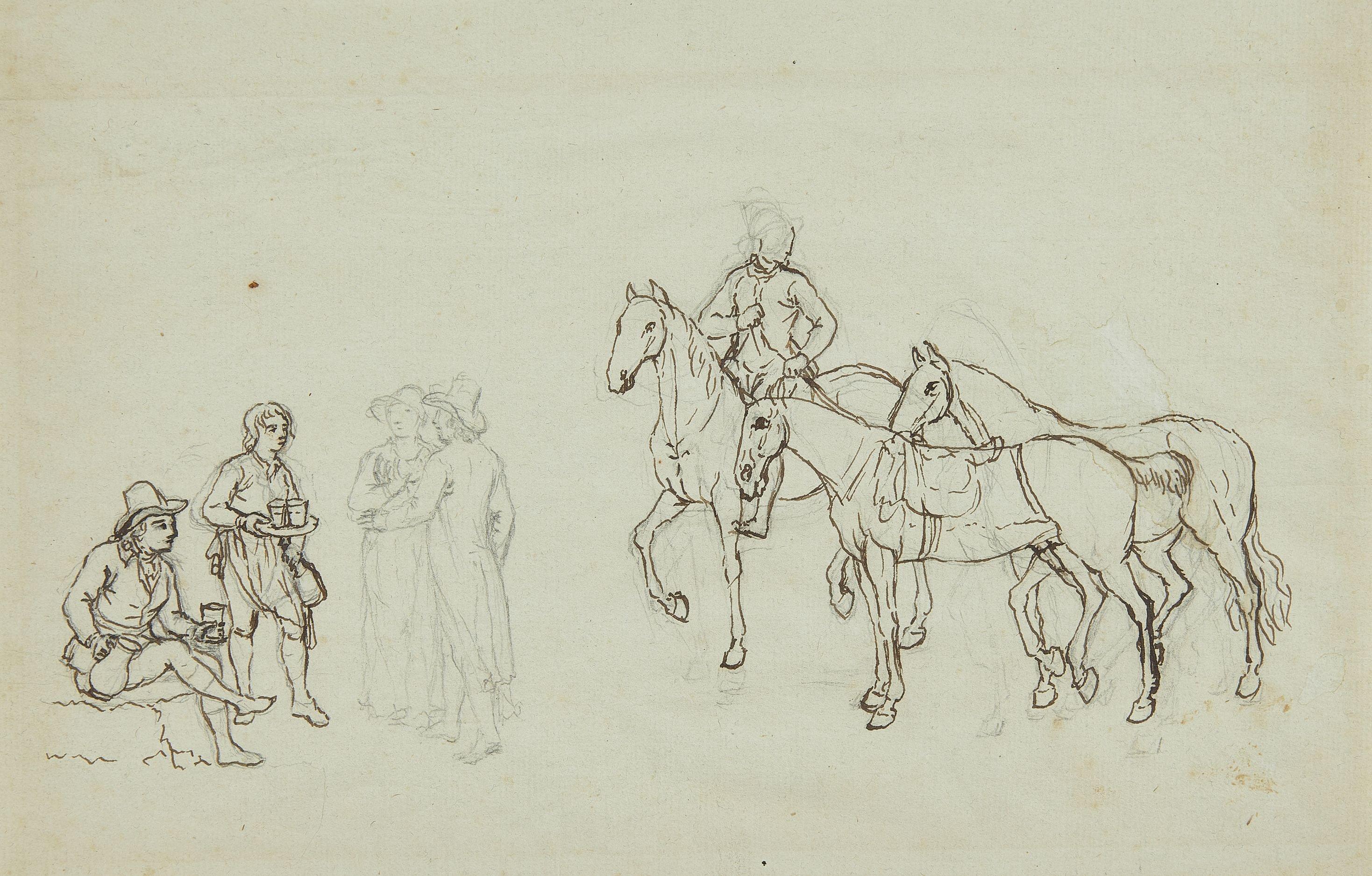 Croquis de personnages dont une femme sur un âne et personnages...