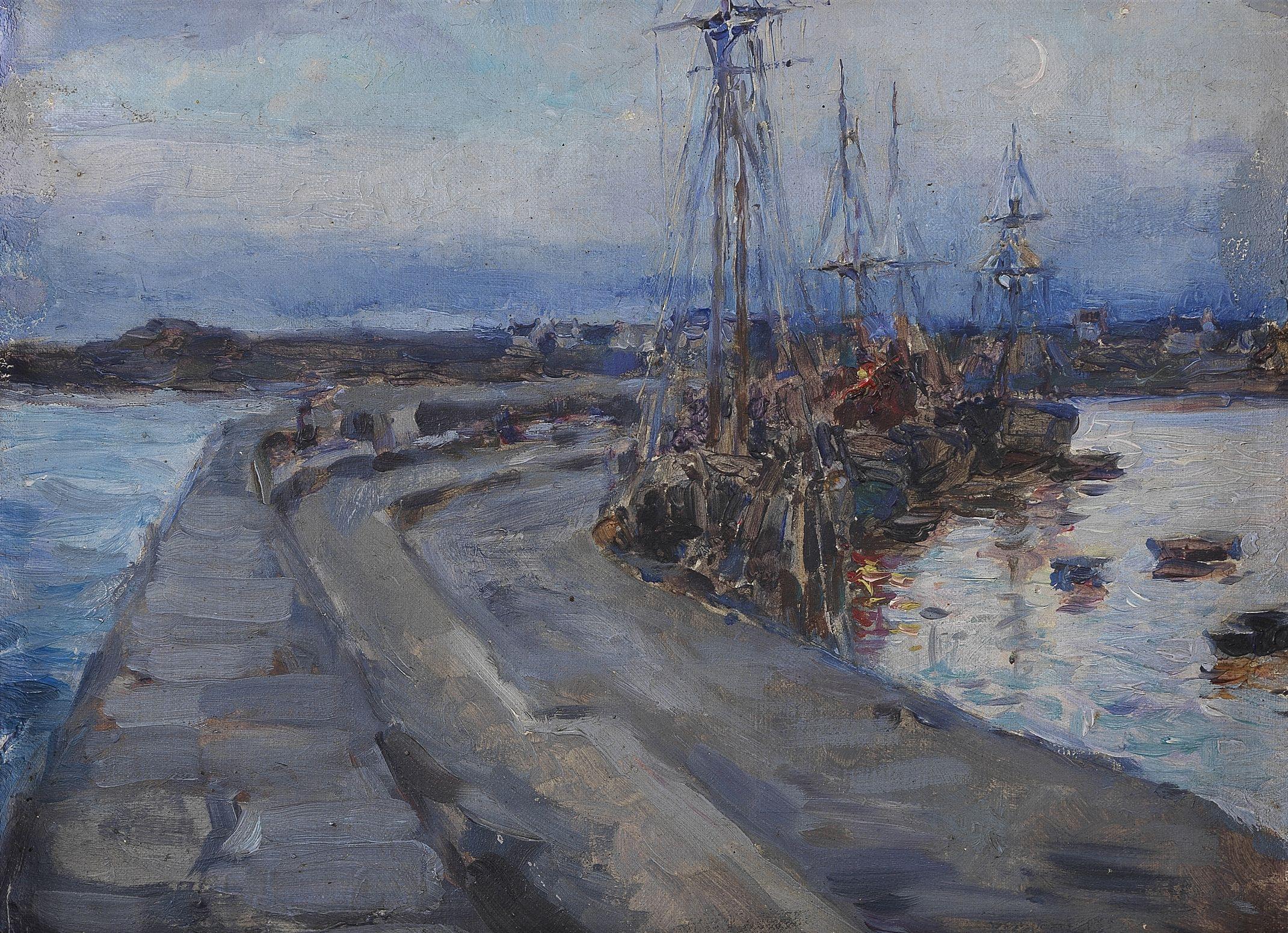 Bateaux au port, huile sur papier, datée 1892 au dos, 17x23 cm.Provenance: Famille de l'artiste.