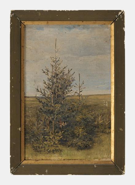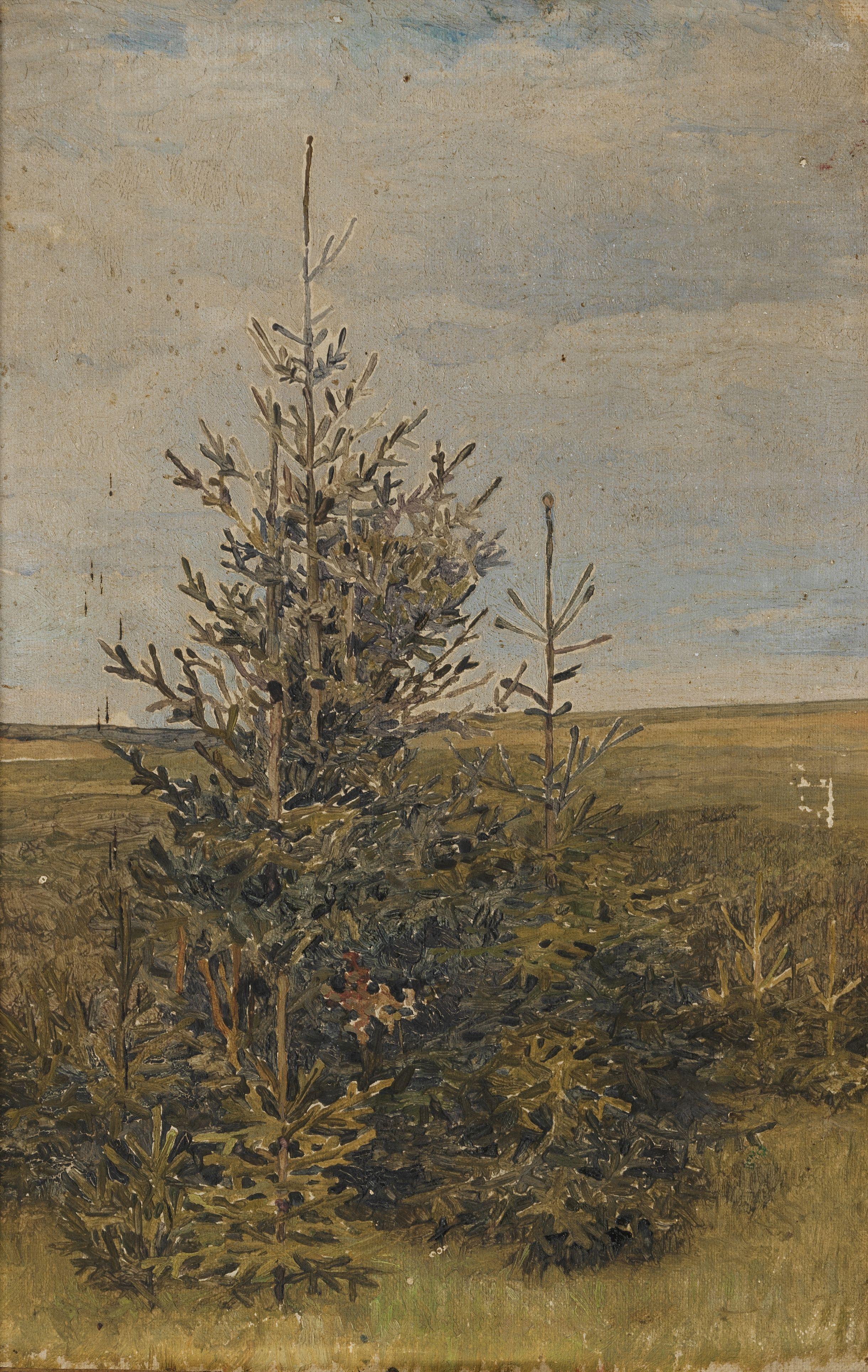 Jeunes sapins, huile sur toile marouflée sur carton, 19,5x12,5 cm. Provenance: Famille de l'artiste