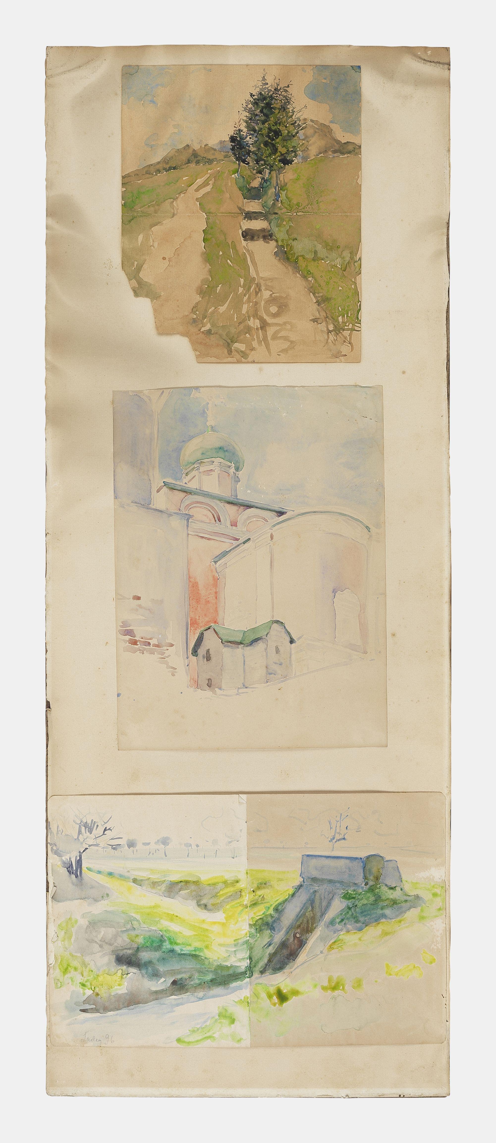 Chemins et église, trois aquarelles, l'une datée 1896, 46x33 cm.Provenance: Famille de l'artiste.
