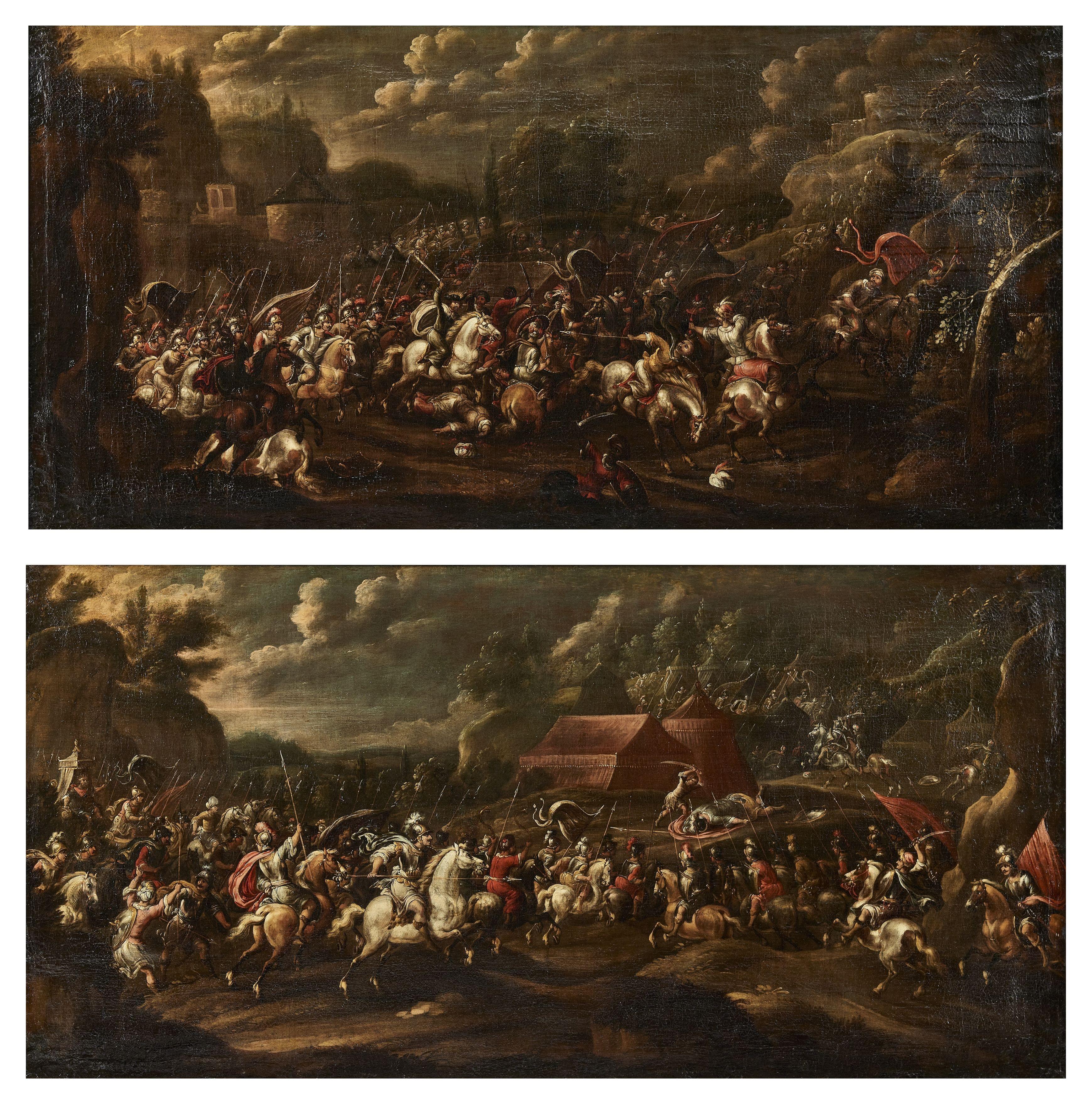 Combat de David et Goliath et Saint-Jacques à la bataille de Clavijo, paire d'huiles sur toile, 85x172 cm