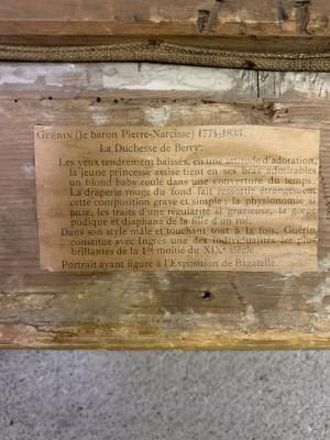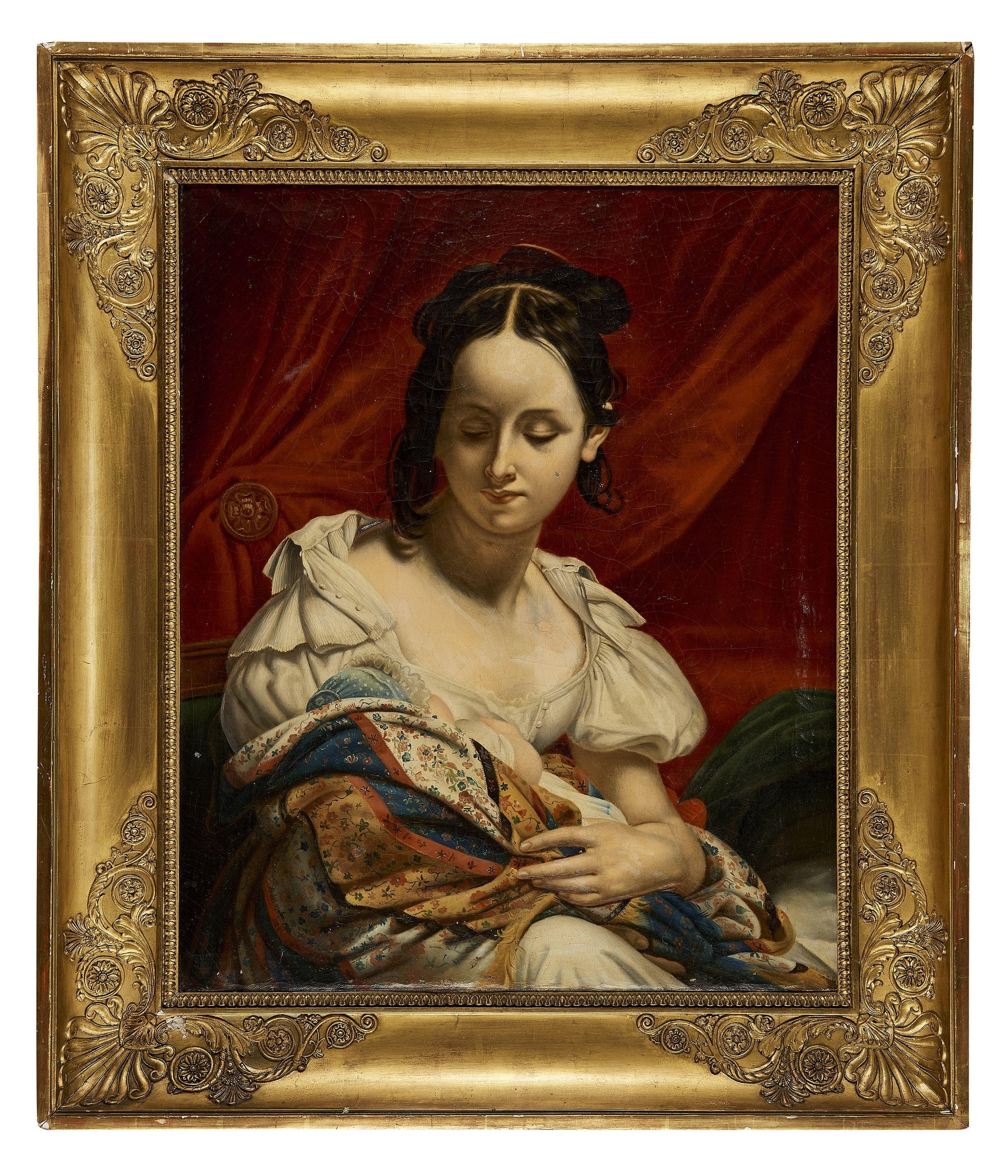 Portrait présumé de la duchesse de Berry tenant son enfant, huile sur toile, 73x60 cm. Attribué selon une ancienne étiquette au dos.