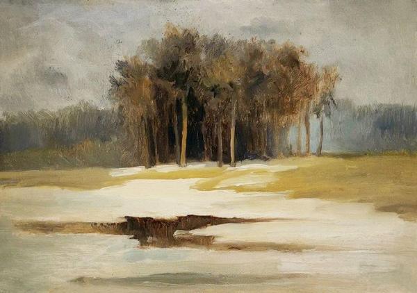 Bosquet en hiver, huile sur carton, datée 1888 au dos,13x19 cm.P...