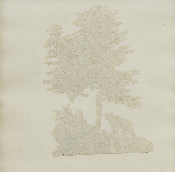 Ours sous un arbre, découpage, papier blanc, 10x10 cm