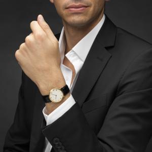Cadran blanc, aiguilles dorées, chiffres arabes noirs, secondes...