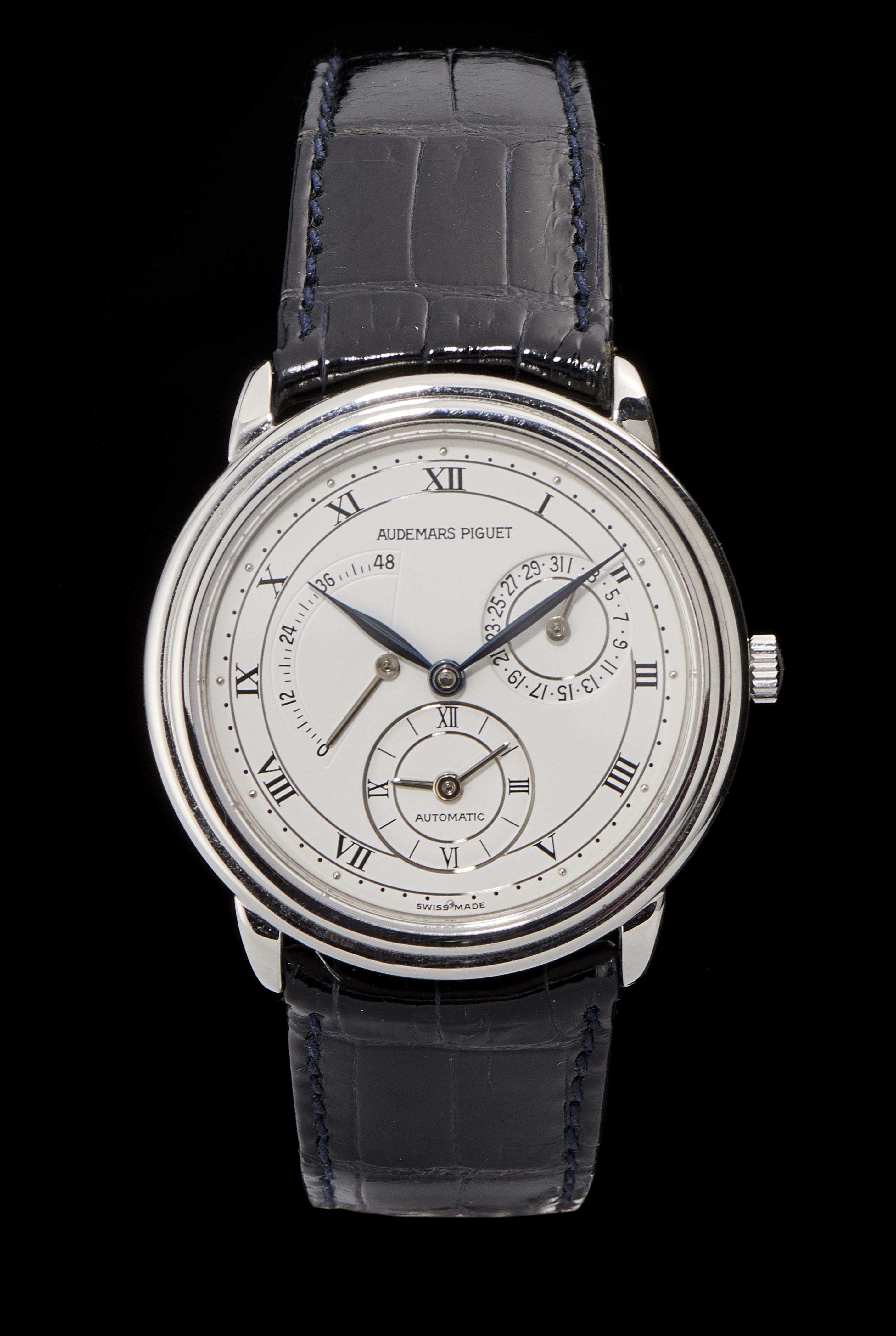 Cadran blanc, chiffres romains noirs, aiguilles bleues, date, réserve de marche 48h, réf. 25685PT, début années 90, platine 950, D 36 mm