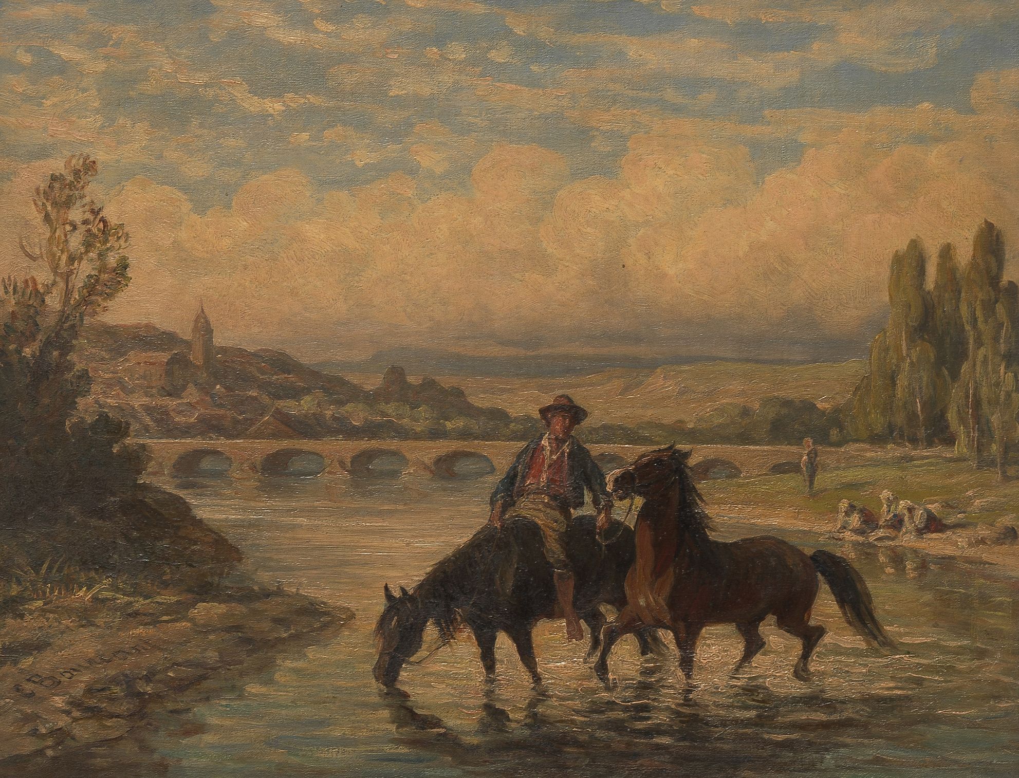 La traversé de la rivière, huile sur toile, signée, 28x35 cm