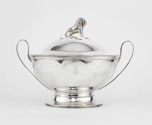 282. Soupière ronde néoclassique armoriée Vernet à frétel lion