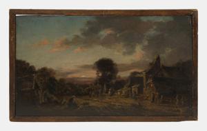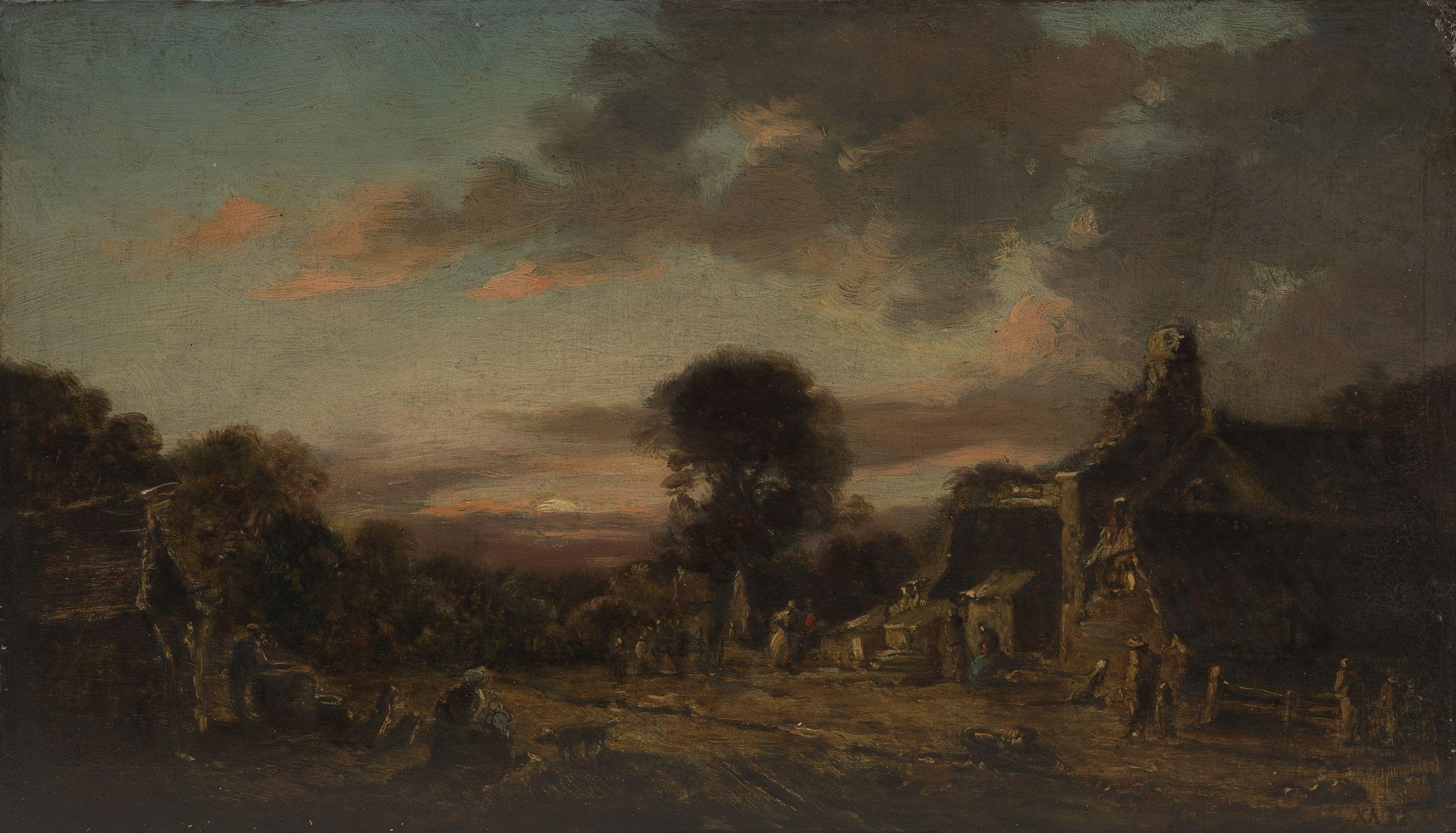 L'aube sur le village, huile sur panneau, monogrammée, 18x29 cm
