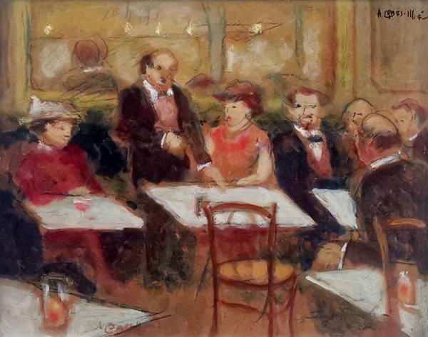 Intérieur de café à Montmartre, huile sur pavatex, signée, 22x27...