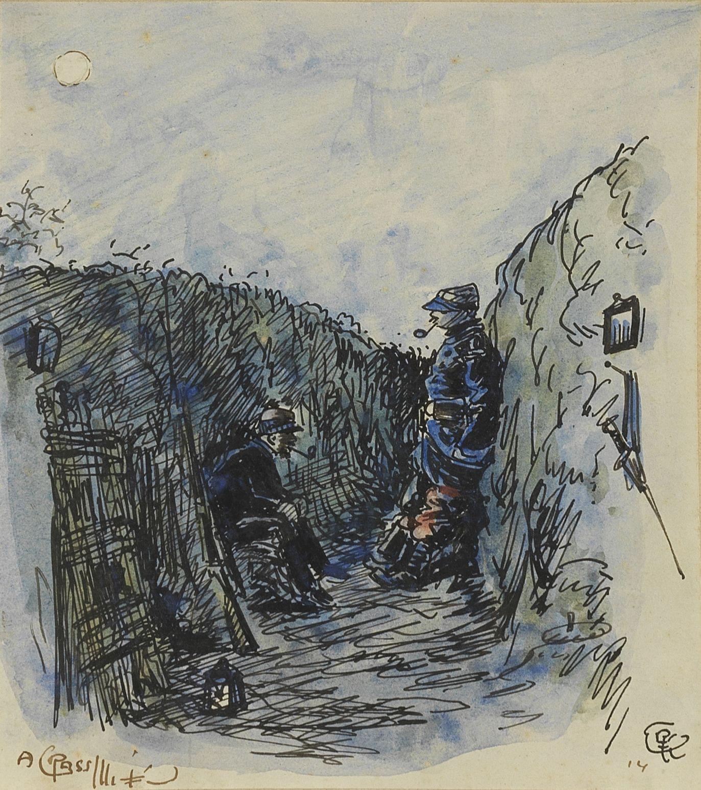 Les premières tranchées, aquarelle sur papier, monogrammée, signée et datée 14, 11x12 cm