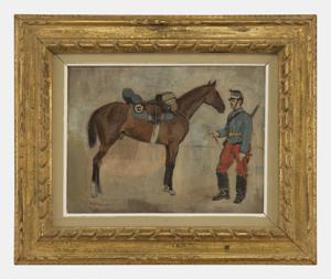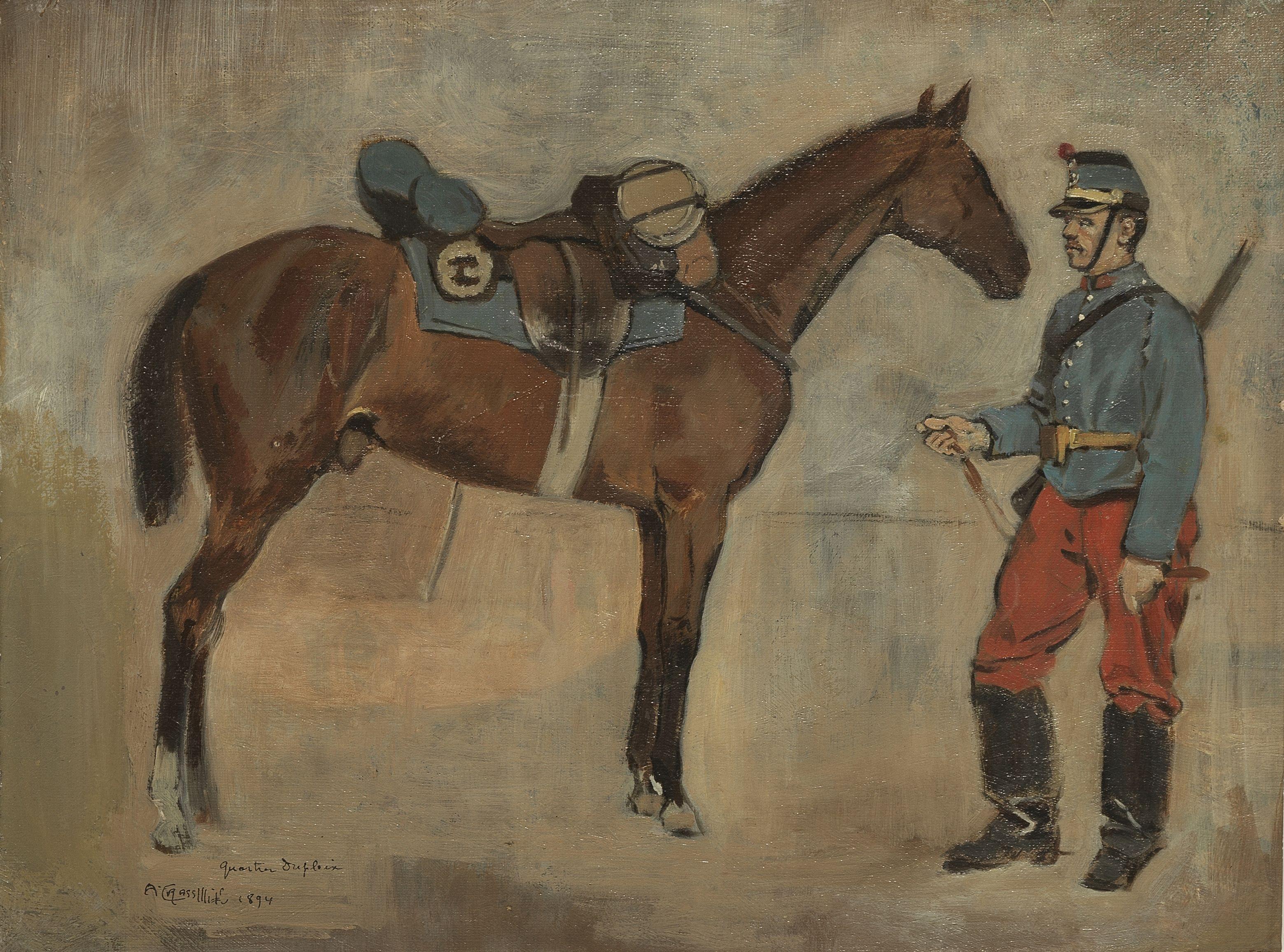Garde et son cheval, huile sur toile marouflée sur pavatex, signée, datée 1894, et localisée au quartier Dupleix, 26x35 cm. Provenance: Galerie Montauti