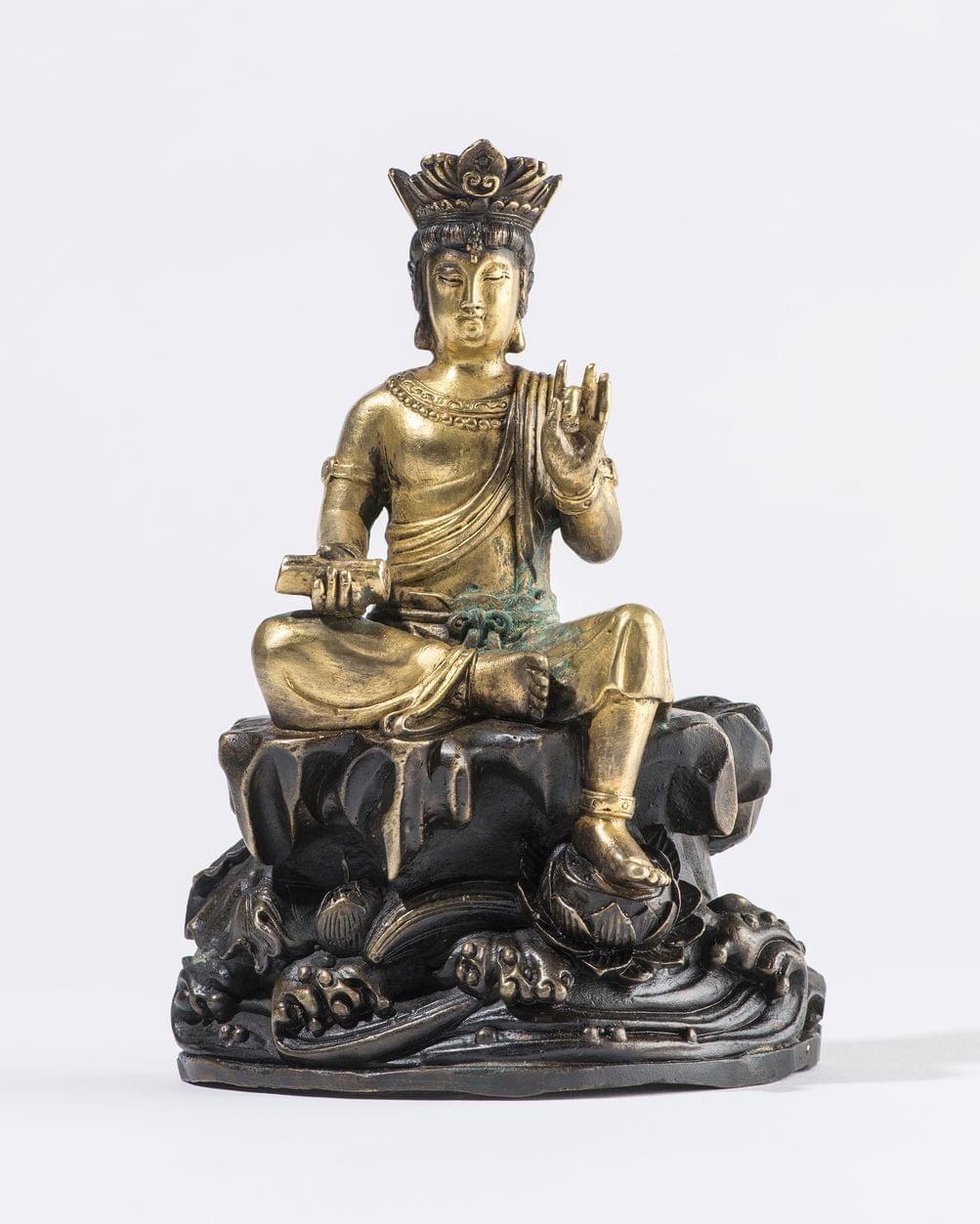 La main gauche en vitarka-mudra et la main droite tenant un rouleau, bronze à patine brune et en partie doré, Chine, dynastie Qing (1644-1911), H 20 cm