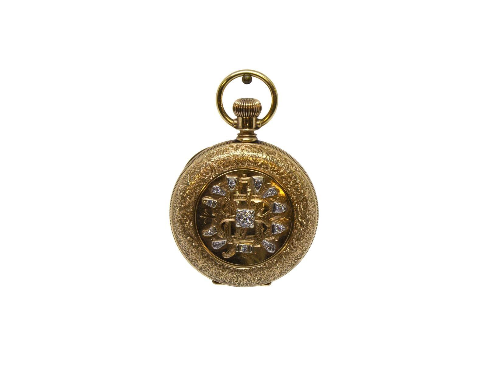 3119. A.W.Co Waltham, montre de poche monogrammée MB serti de diamants et gravée d'une vue de village au revers