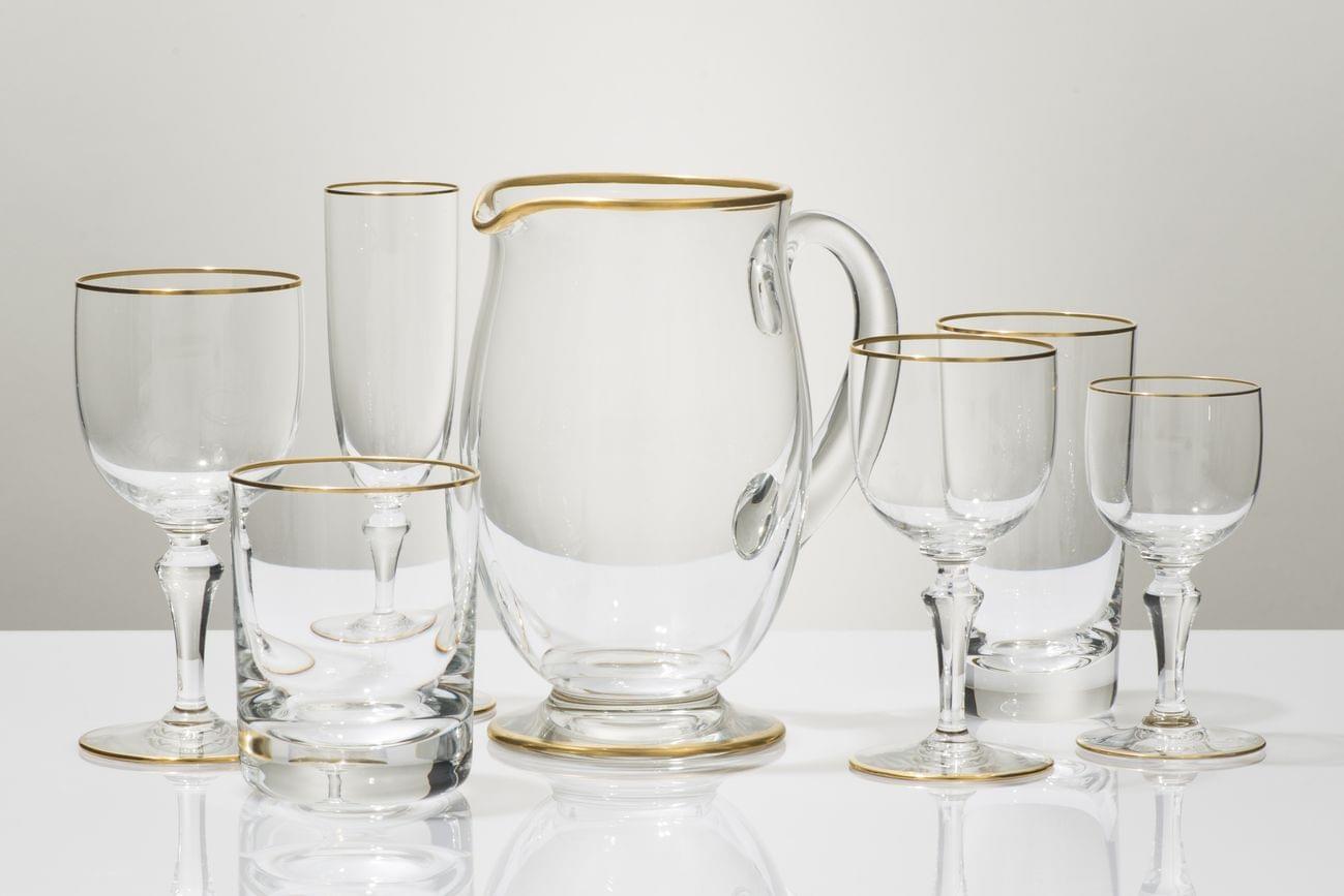 Cristal, comprenant: 40 verres à eau, 40 verres à vin rouge, 40 à vin blanc, 40 à vin doux, 40 flûtes à champagne, 35 à whisky, 4 carafes et 2 seaux (241p)