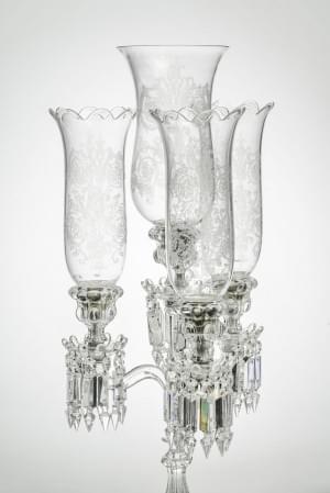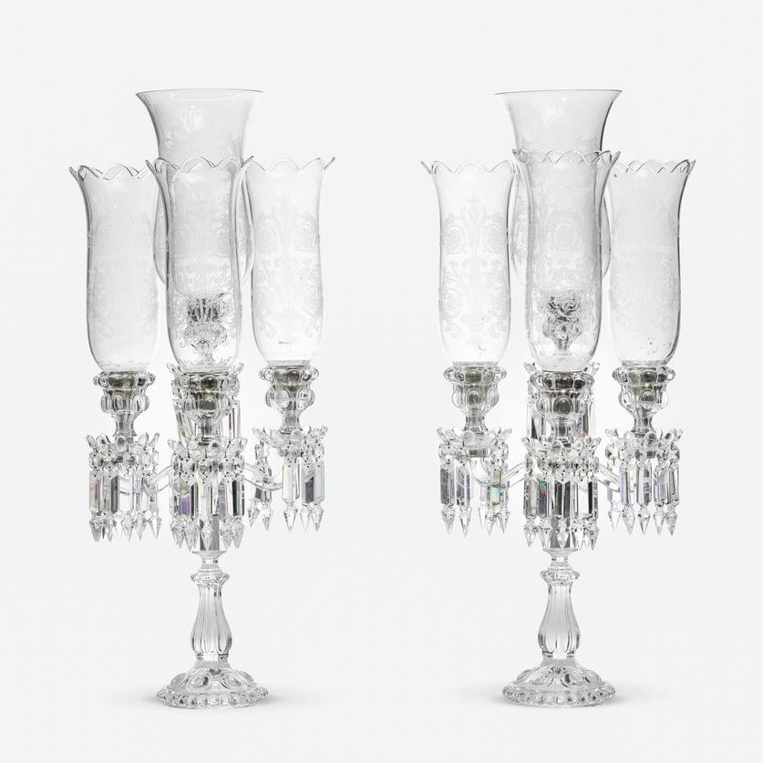 441. Baccarat, paire de candélabres à quatre bras de lumière ornés de pampilles et surmontés de tulipes gravées de rinceaux