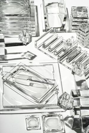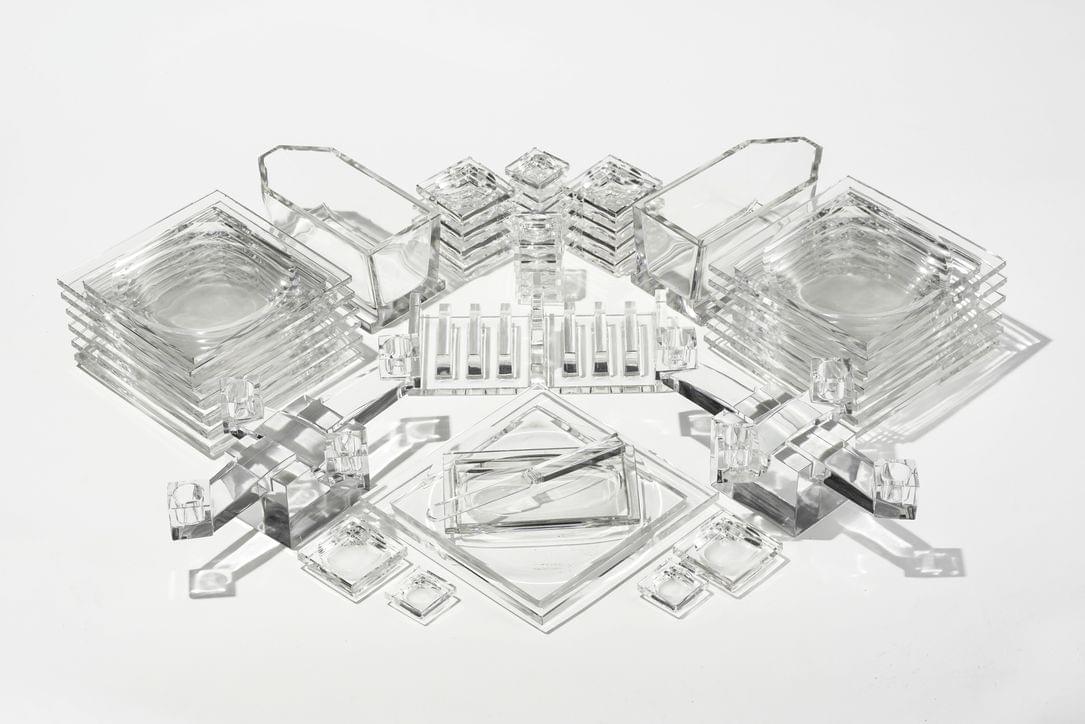 Dessiné par Georges Chevalier, directeur artistique, années 1930, cristal, comprenant: 12 assiettes carrées, 12 salerons individuels, 10 coupelles, 2 candélabres à quatre feux, 2 bouquetières, 1 beurrier, 1 plat, 1 porte-toasts (41p)