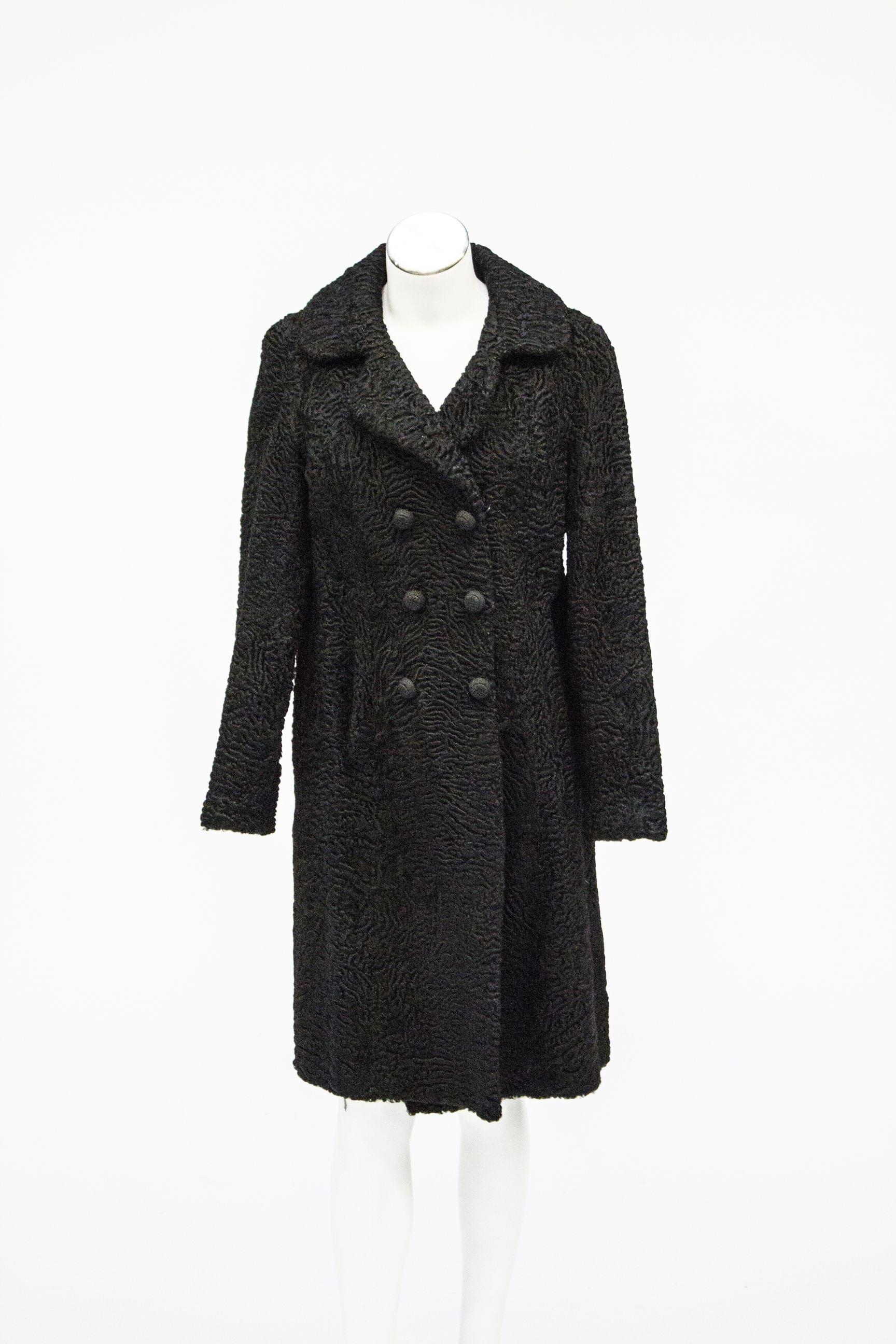 Astrakan noir, intérieur soie, poches latérales, fermeture à clips