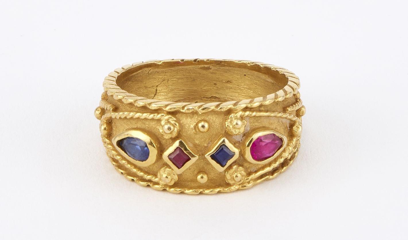 3292. Bague à décor de granulation serti de saphirs et de rubis