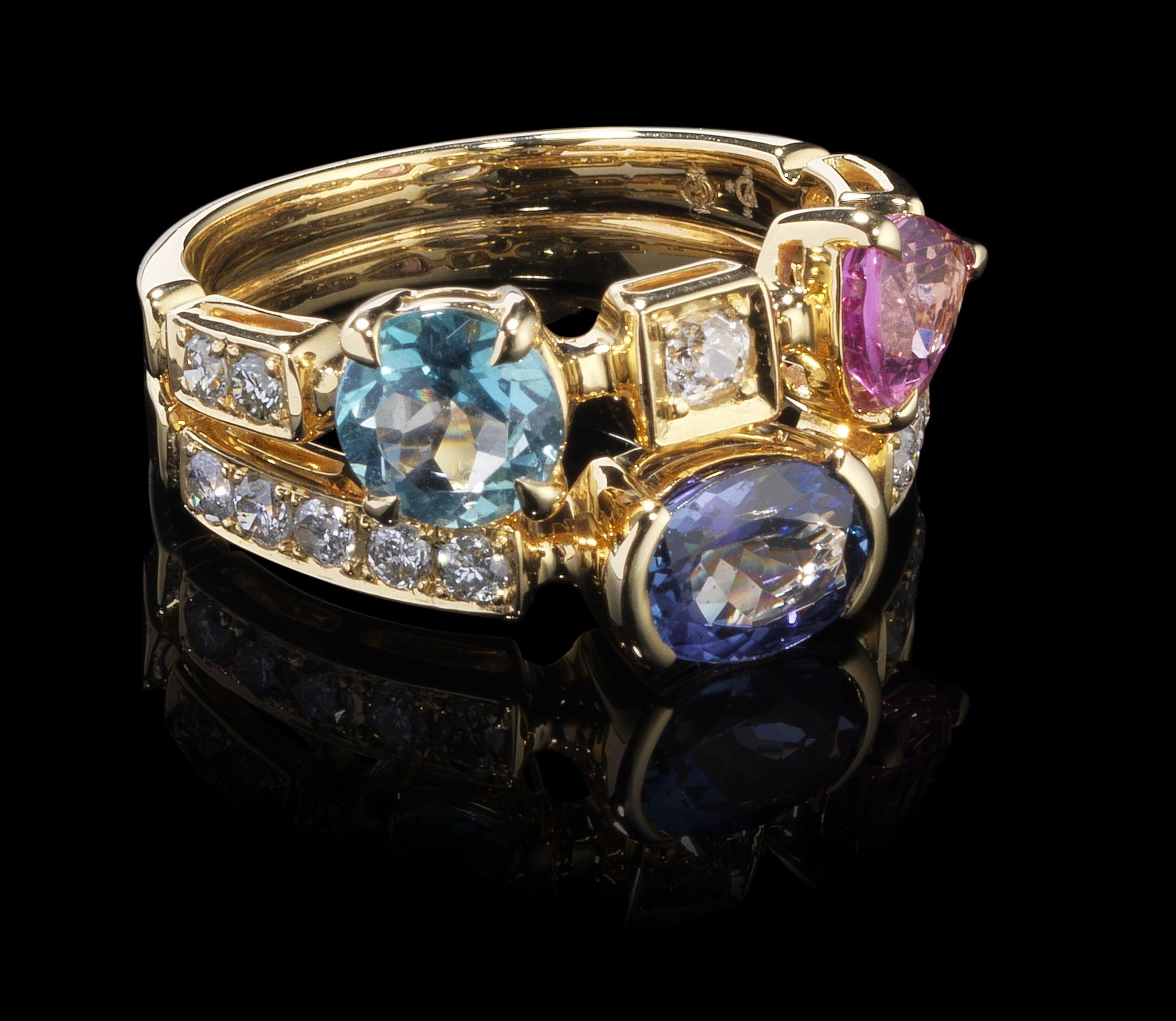 Sertie d'un saphir Padparadsha taille poire (env. 0,8 ct), d'une tanzanite taille ovale (env. 1 ct) et d'une topaze bleue taille brillant (env. 0,8 ct), rehaussés de diamants (env. 0,65 ct), or 750, doigt 54-14, 7 g, accompagnée d'un certificat GFCO. Pour les lots précédés d'un *, la TVA de 7,7% est due sur l'entier du prix d'adjudication.