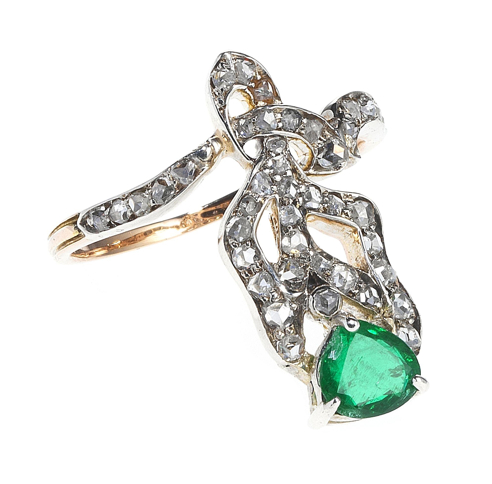 3297. Bague à motif ajouré serti d'une émeraude taille poire (env. 0,3 ct) et pavée de roses de diamant