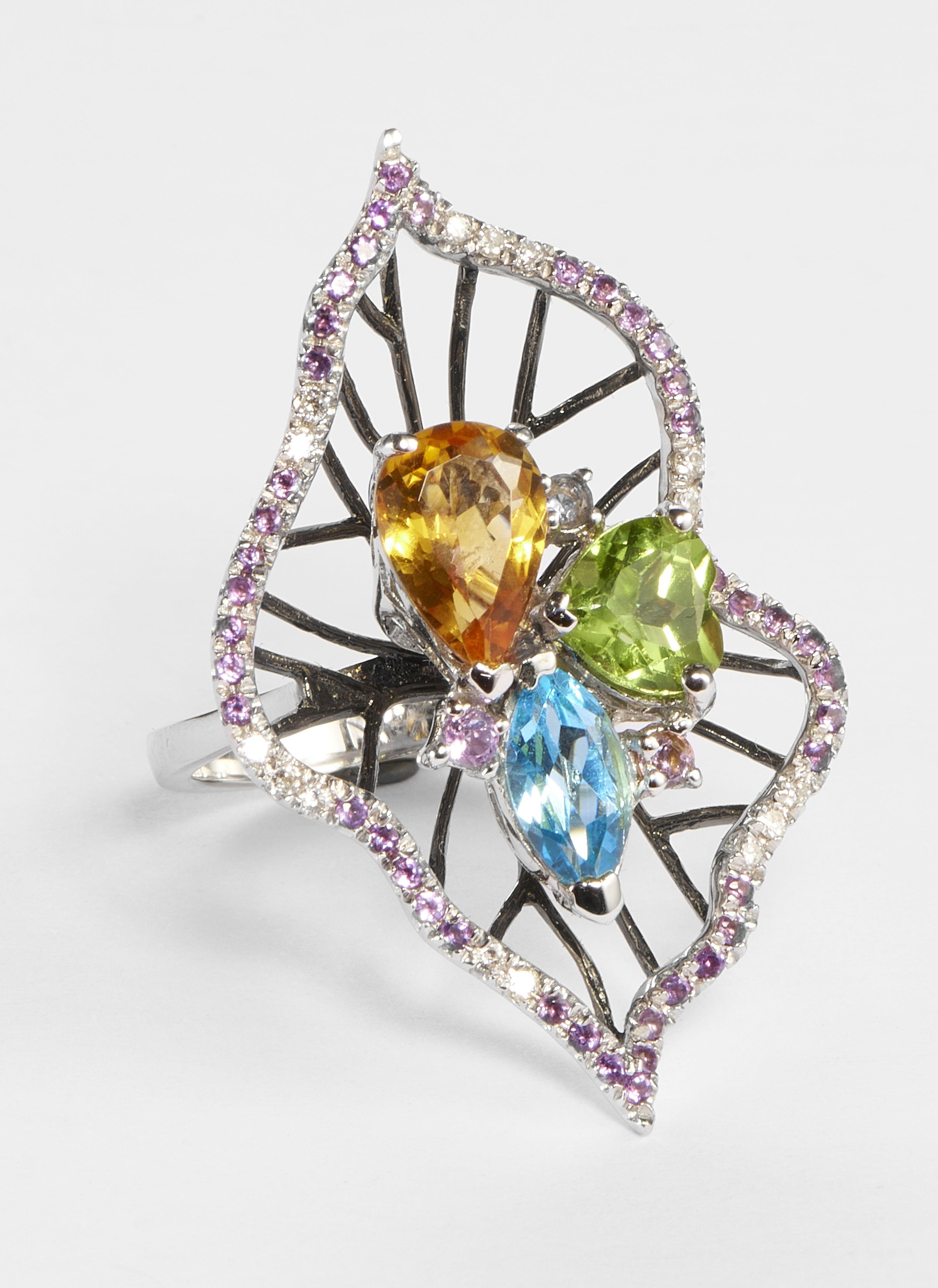 3240. Bague à motif ajouré serti d'une citrine taille poire, d'une topaze bleue taille marquise et d'un péridot taille cœur rehaussé d'améthystes et entouré de diamants et d'améthystes