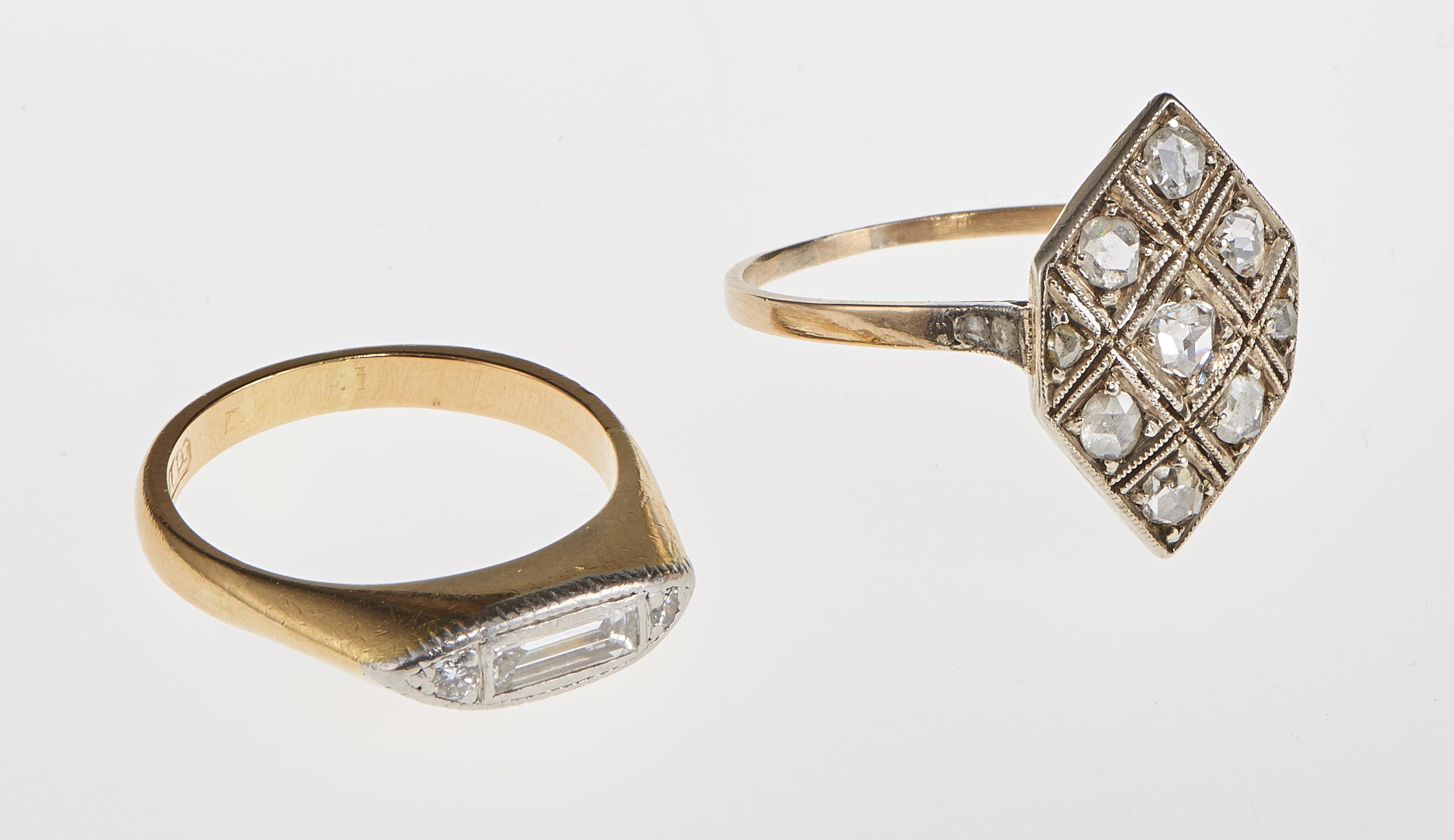 Or et or gris 585, doigt 63-23. On joint une bague sertie d'un diamant taille baguette épaulé de deux diamants.