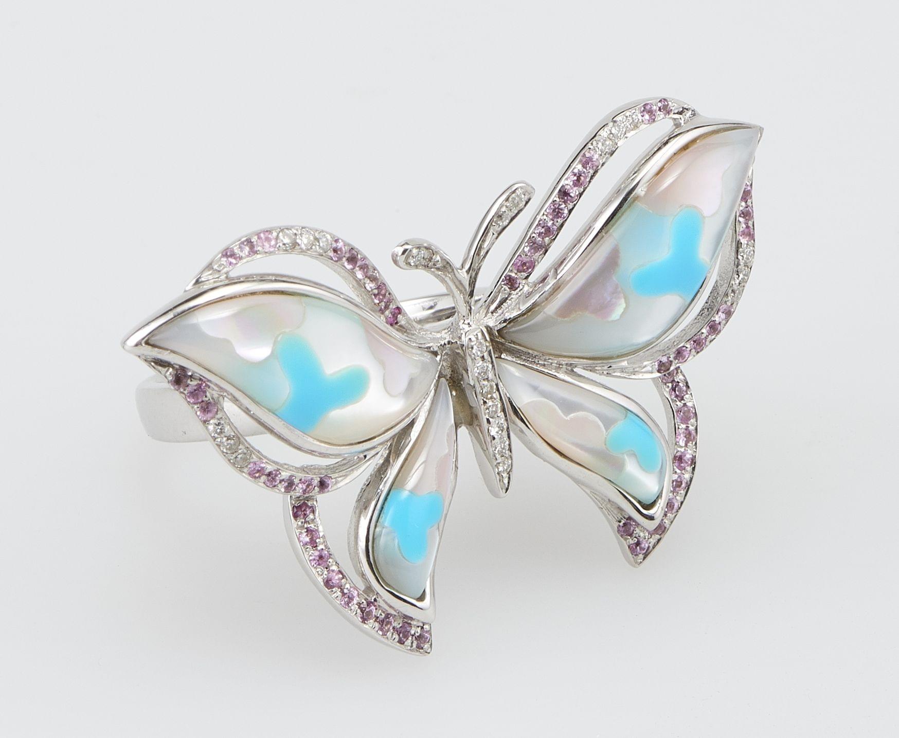 3424. Bague à motif d'un papillon aux ailes serties de nacre et rehaussées de diamants et de saphirs roses