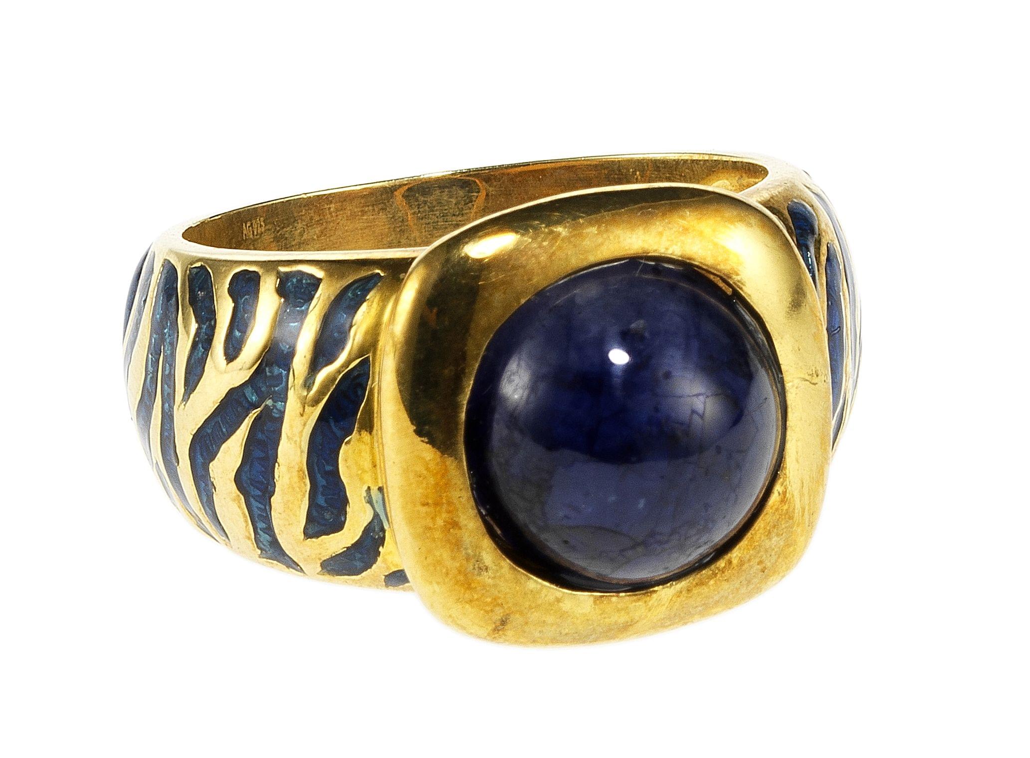 3062. *Bague à motifs émaillés bleus sertie d'un saphir rond taille cabochon